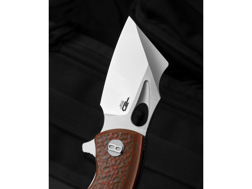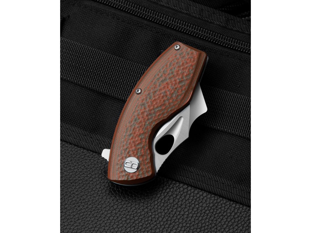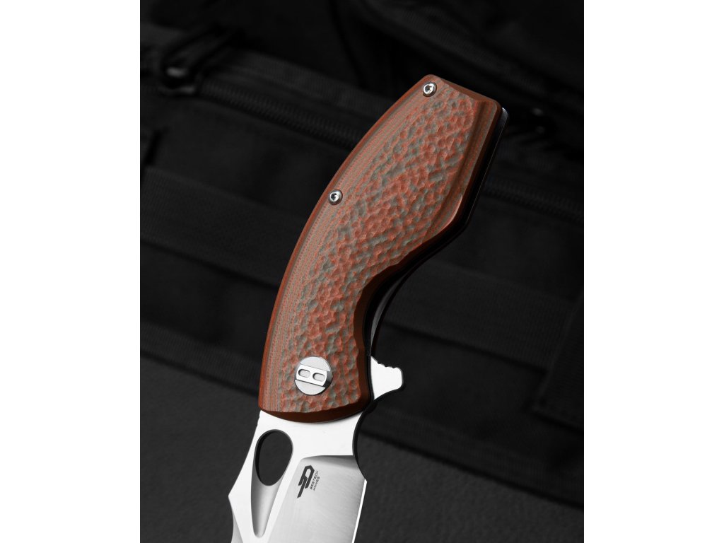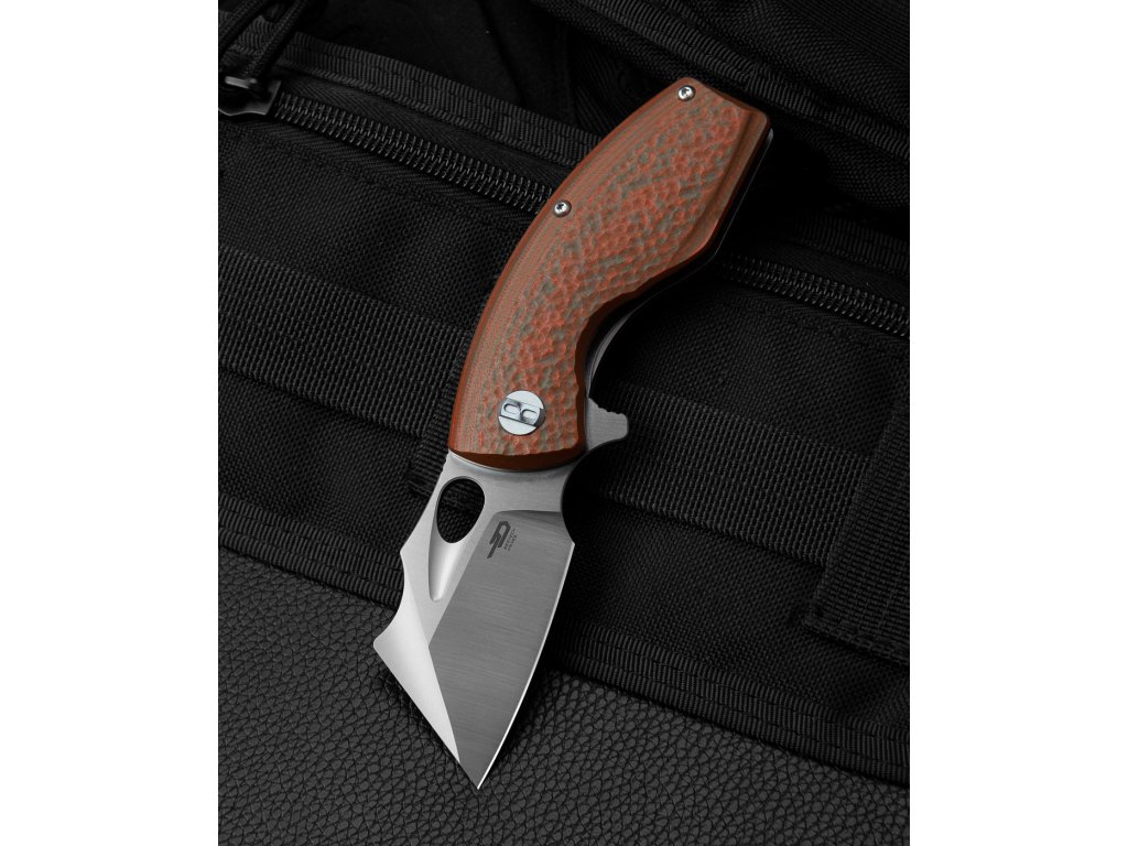 Bestech Lizard este un cuțit pliabil mai mic cu un design original. Lama cu o formă modificată sheepsfoot, din oțel pentru unelte D2, cu tăiș flat grind, are o lungime de 6,1 cm și este montată pe rulmenți ceramici. Mânerul este fabricat din G10 texturat cu finisaj verde-portocaliu. Blocaj tip Liner Lock. Clemă din oțel pentru agățare. Deschidere tip flipper.