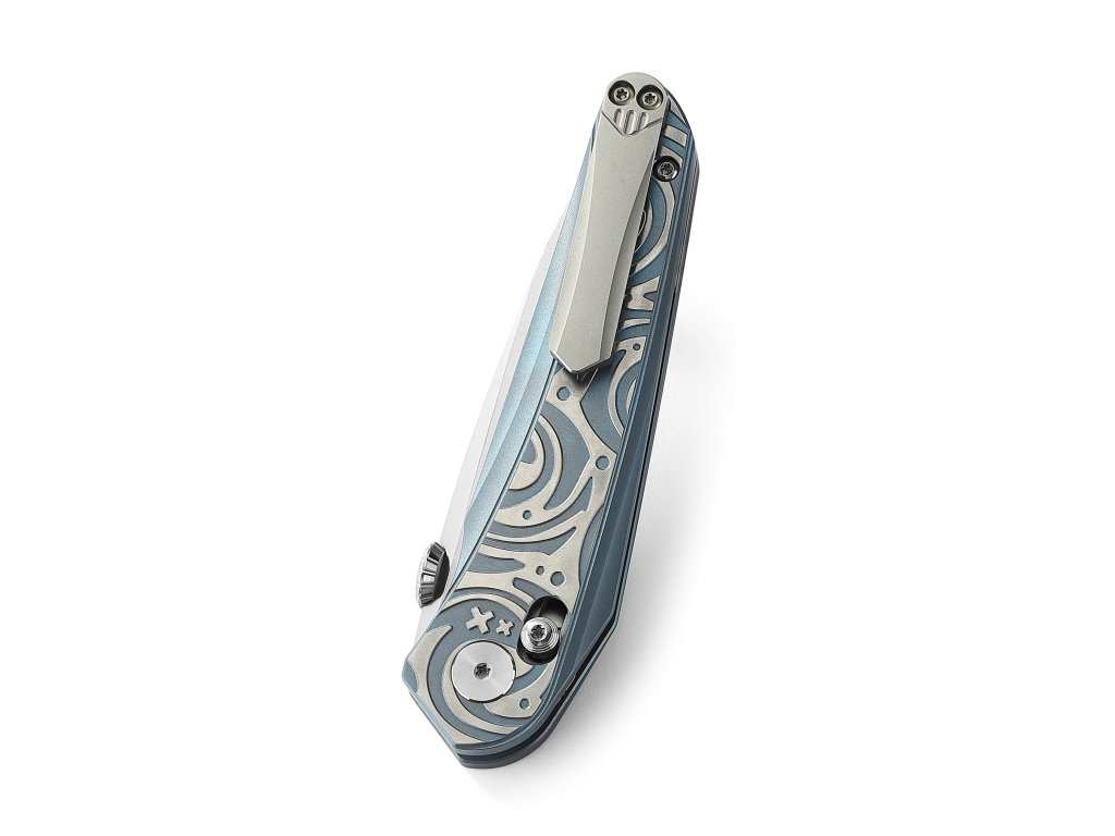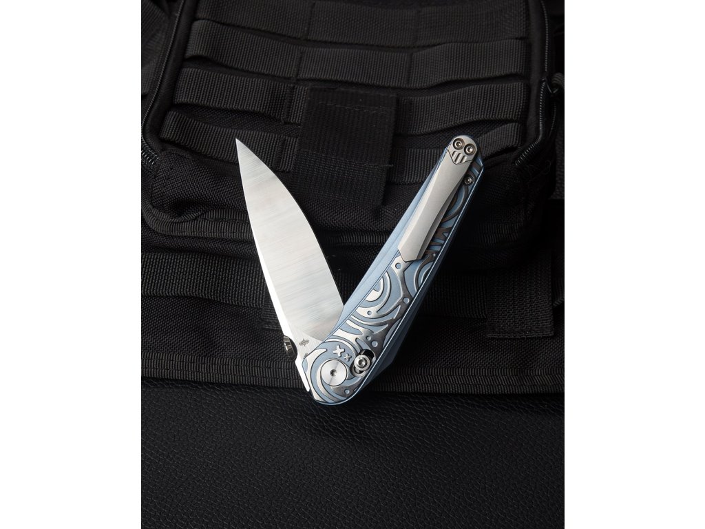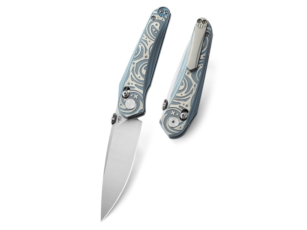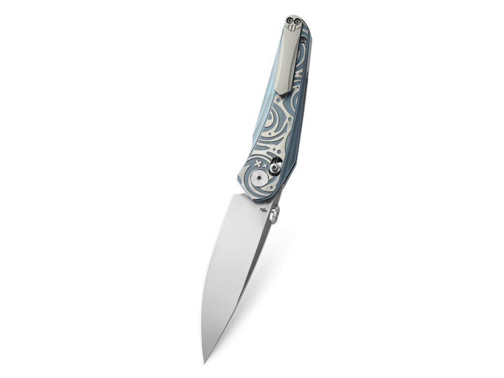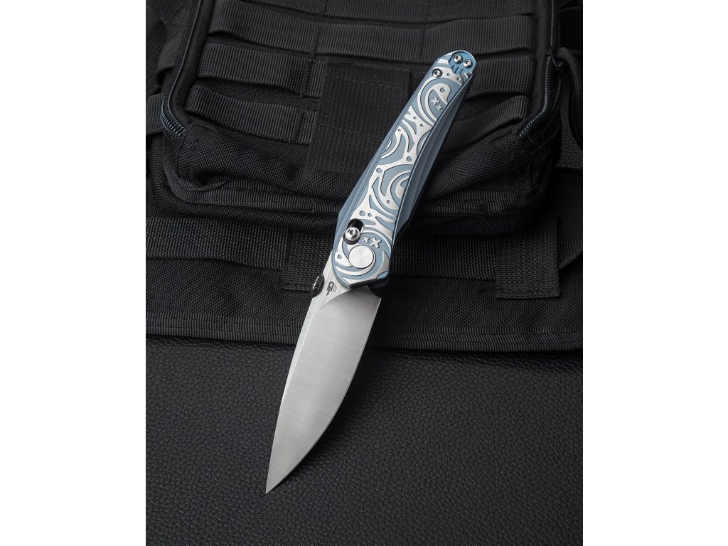 Bestech Mothus BT2206A este un cuțit pliabil cu un design unic realizat din materiale premium. .Lama este montată pe rulmenți ceramic, este fabricată din oțel premium M390, are formă drop point, o lungime de 8,8 cm și un finisaj satinat. Duritatea oțelului variază între 59 - 61 HRC. Atât mânerul, cât și clema pentru agățarea cuțitului sunt realizate din titan argintiu și albastru deschis.