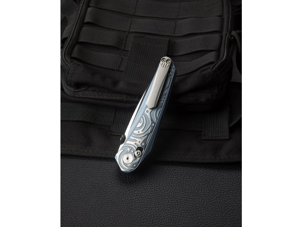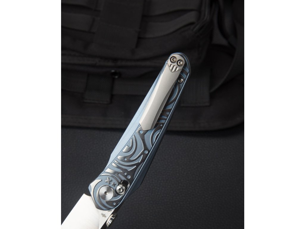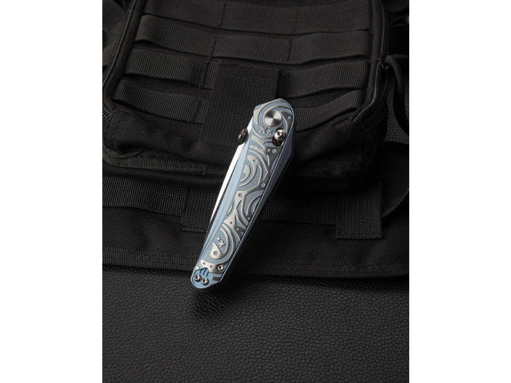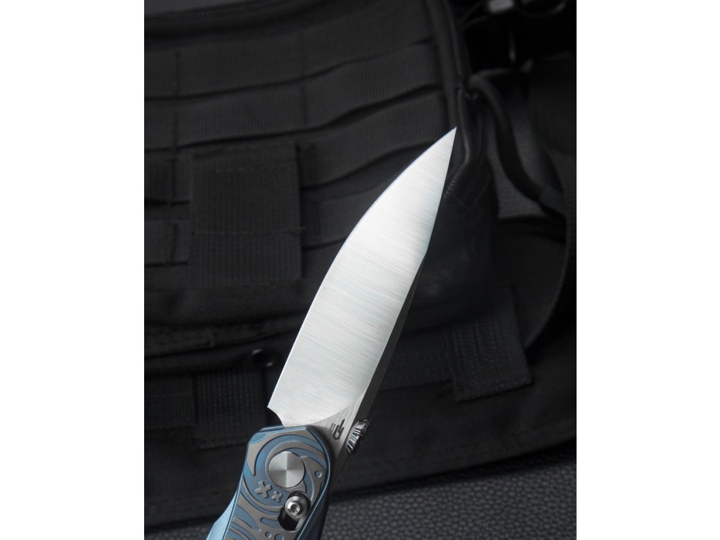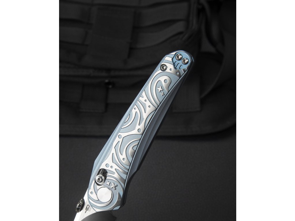 Bestech Mothus BT2206A este un cuțit pliabil cu un design unic realizat din materiale premium. .Lama este montată pe rulmenți ceramic, este fabricată din oțel premium M390, are formă drop point, o lungime de 8,8 cm și un finisaj satinat. Duritatea oțelului variază între 59 - 61 HRC. Atât mânerul, cât și clema pentru agățarea cuțitului sunt realizate din titan argintiu și albastru deschis.