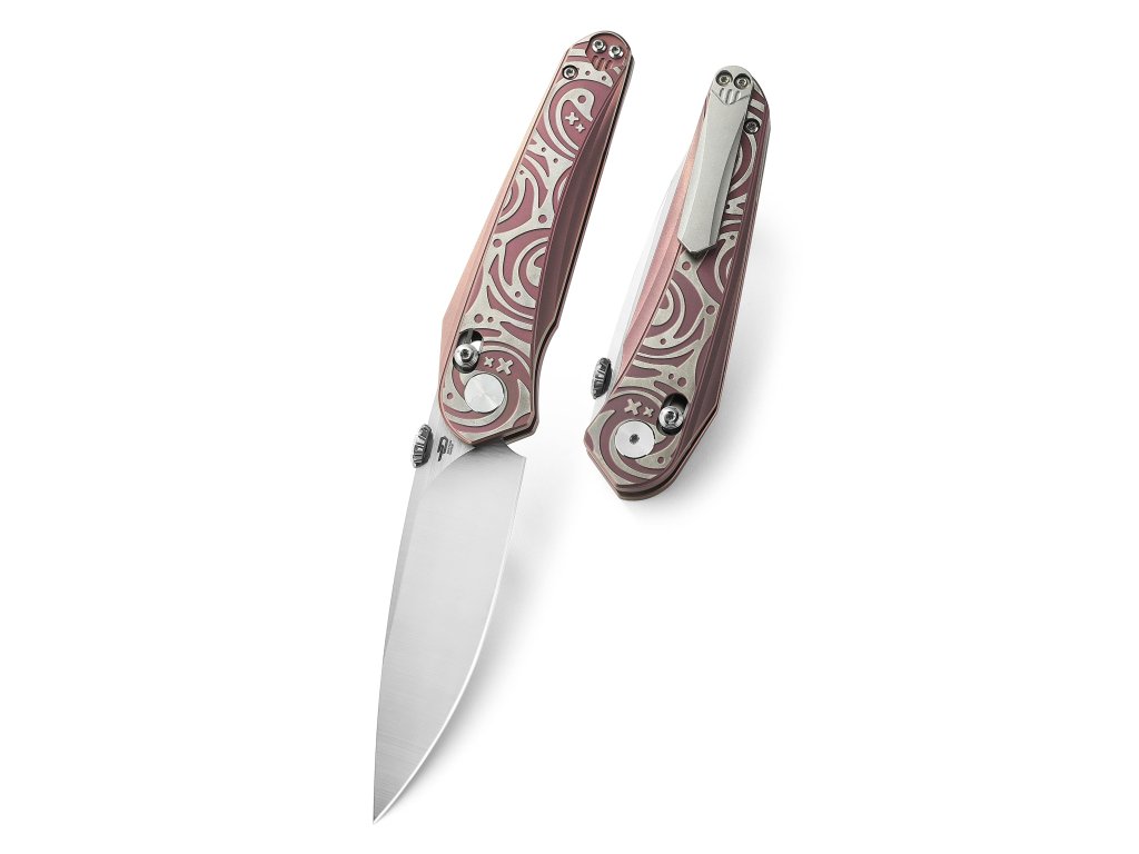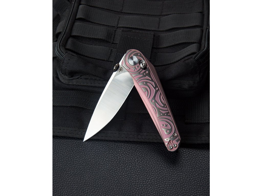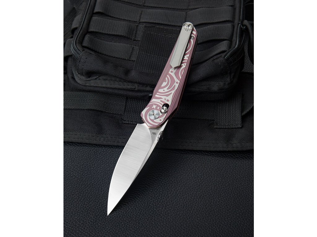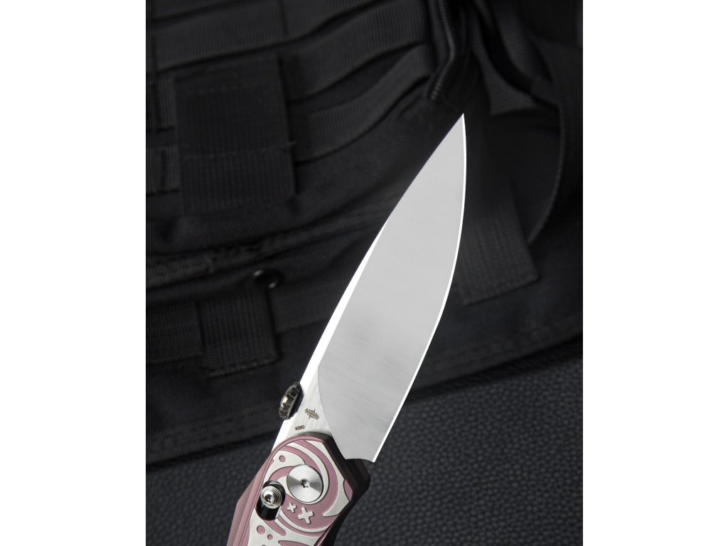 Bestech Mothus BT2206D este un cuțit pliabil cu un design unic realizat din materiale premium. .Lama este montată pe rulmenți ceramic, este fabricată din oțel premium M390, are formă drop point, o lungime de 8,8 cm și un finisaj satinat. Duritatea oțelului variază între 59 - 61 HRC. Mânerul și clema pentru agățat sunt realizate din titan în culorile roz și gri.