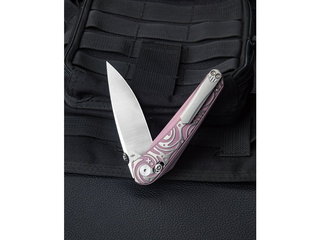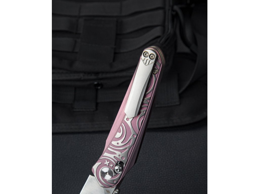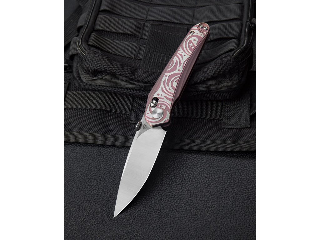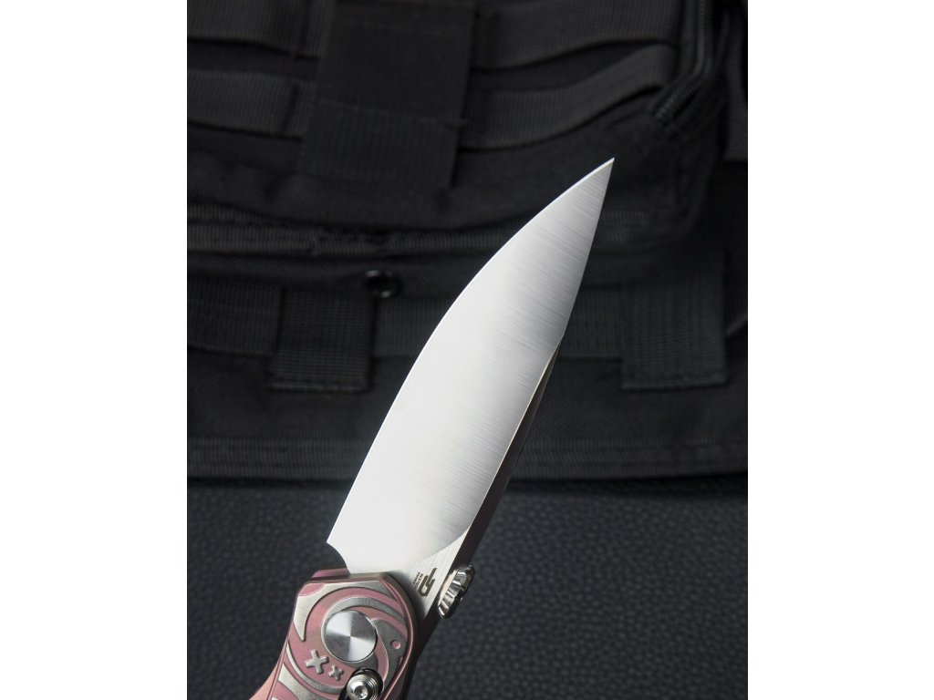 Bestech Mothus BT2206D este un cuțit pliabil cu un design unic realizat din materiale premium. .Lama este montată pe rulmenți ceramic, este fabricată din oțel premium M390, are formă drop point, o lungime de 8,8 cm și un finisaj satinat. Duritatea oțelului variază între 59 - 61 HRC. Mânerul și clema pentru agățat sunt realizate din titan în culorile roz și gri.