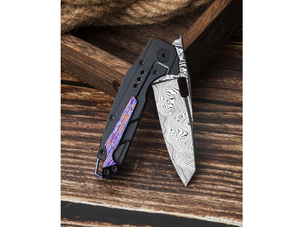 Deși mânerul cuțitului are un aspect neobișnuit, ergonomia sa este cu adevărat excelentă. Acesta este fabricat din titan negru și este unul dintre cele mai plăcute mânere pe care am pus vreodată mâna. Cuțitul are un clemă de agășare fabricată din timascus exclusiv. De asemenea, backspacerul este fabricat din acest material.