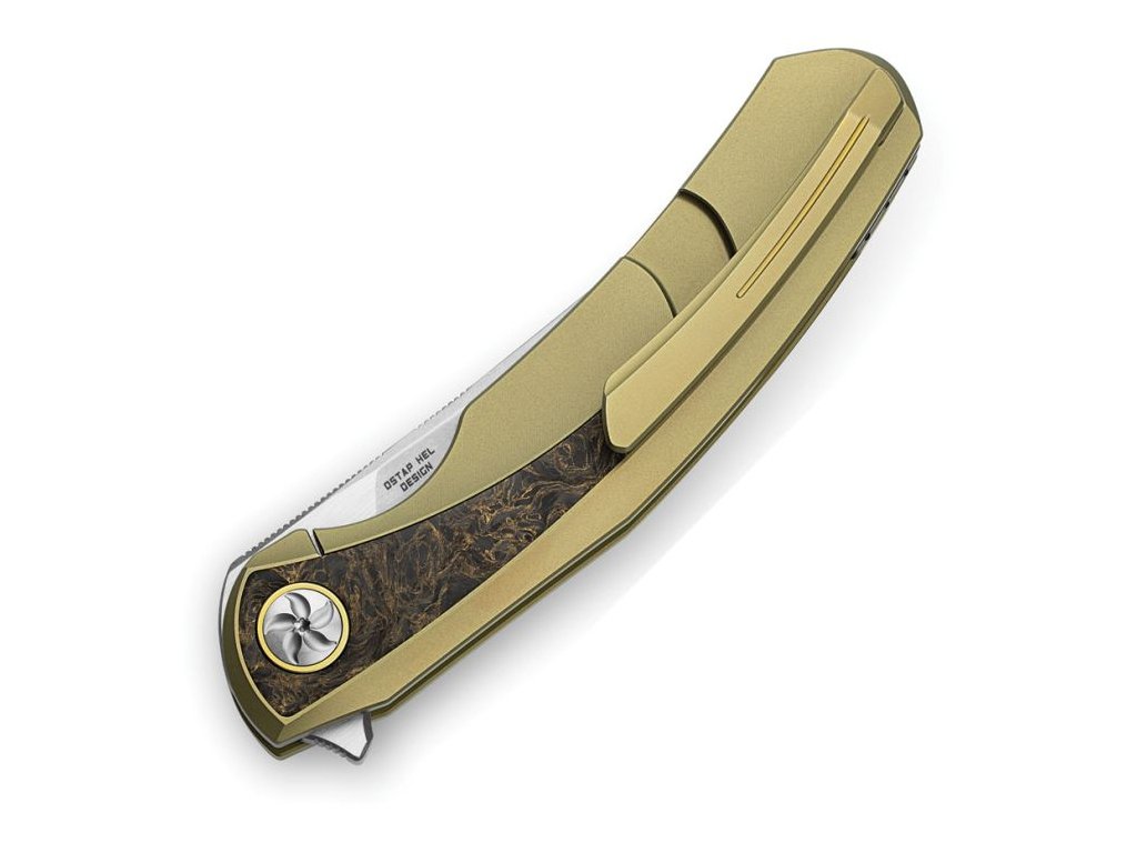 Cuțitul pliabil exclusiv Bestech Sambac Frame Lock Gold BT2402A realizat din materiale de cea mai bună calitate și cu o ascuțime excelentă. Lama este fabricată din oțel inoxidabil superior CPM-Magna Cut și are o duritate ridicată de 62-63 HRC. Lungimea lamei este 9,2 cm. Lama se deschide extrem de ușor datorită rulmenților ceramici și are o blocare a lamei tip frame lock. Întregul mâner este realizat din titan anodizat auriu, iar în partea din mijloc a fost aplicat un strat de fibră de carbon, care nu face decât să sporească eleganța cuțitului. Procesul de anodizare asigură un tratament chimico-termic al suprafeței.