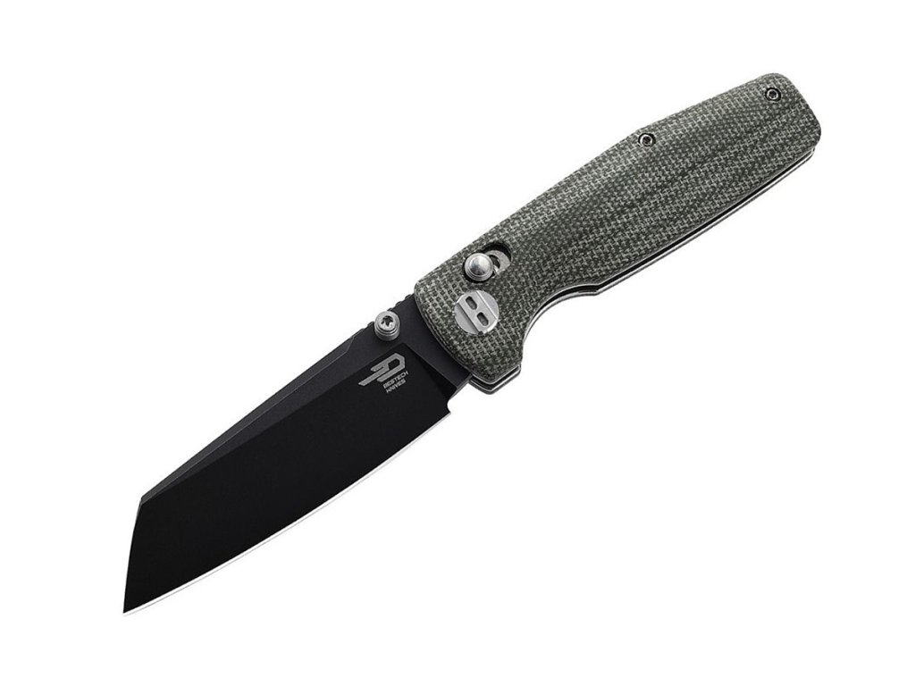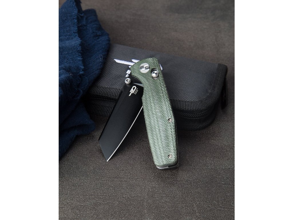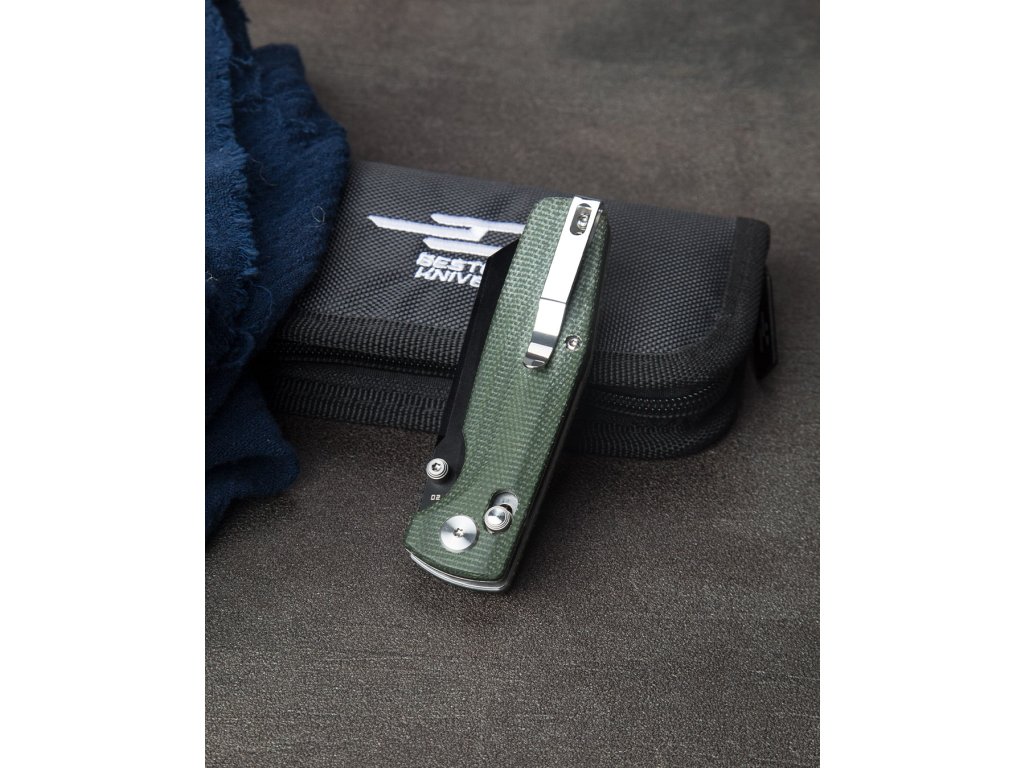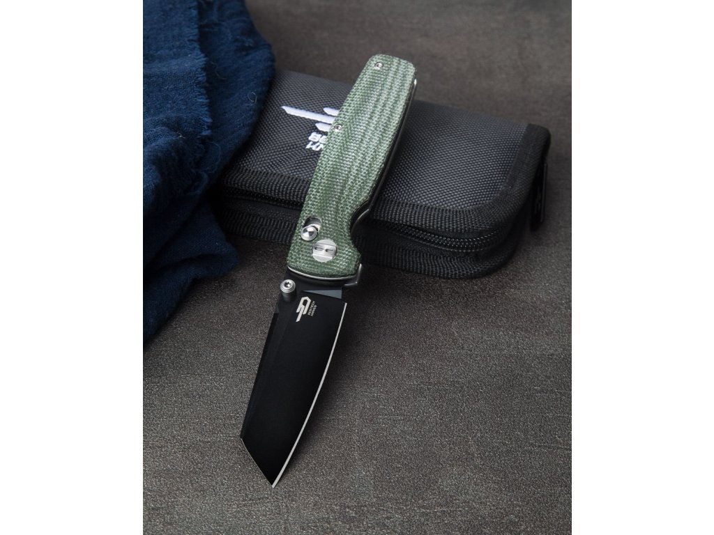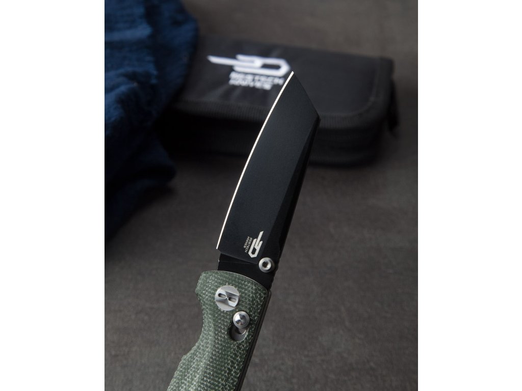 Bestech Slasher BG43B-2 este un cuțit EDC cu o lamă de formă sheepfoot potrivit pentru utilizarea zilnică. Blocare a lamei tip Bar Lock (Axis). Lamei de lungime 7,8 cm este fabricată din oțel tradițional D2 cu finisaj negru stonewash și tăiș flat grind. Lamă este montată pe rulmenți ceramici, ceea ce asigură o deschidere ușoară a cuțitului. Mânerul din micarta de culoare verde tradițională adaugă o notă de eleganță cuțitului. Cuțitul poate fi deschis foarte confortabil cu un singur deget (mecanism thumb stud).