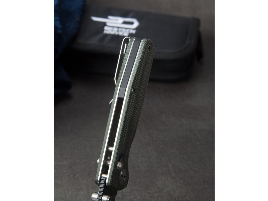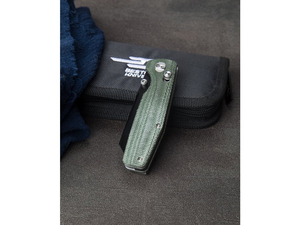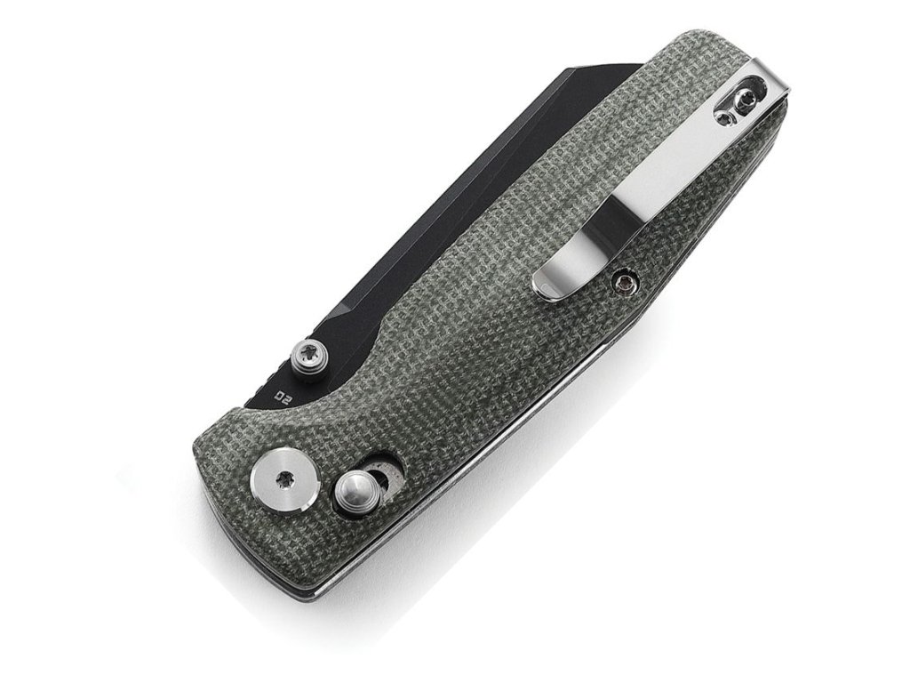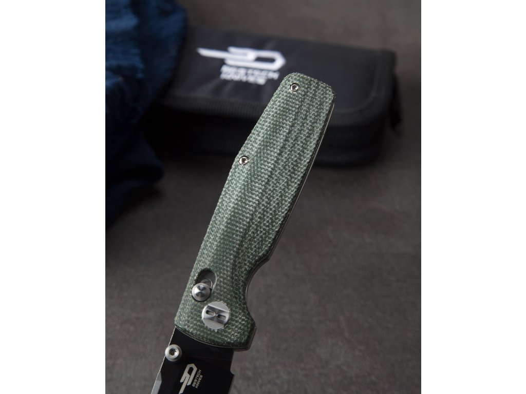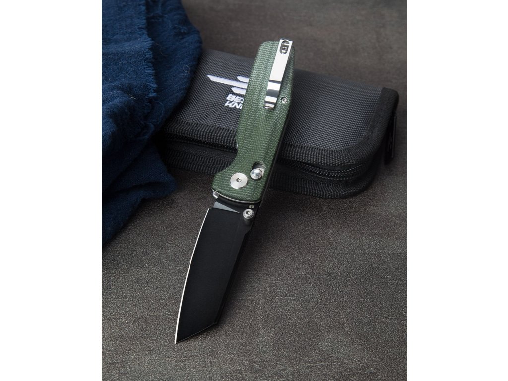 Bestech Slasher BG43B-2 este un cuțit EDC cu o lamă de formă sheepfoot potrivit pentru utilizarea zilnică. Blocare a lamei tip Bar Lock (Axis). Lamei de lungime 7,8 cm este fabricată din oțel tradițional D2 cu finisaj negru stonewash și tăiș flat grind. Lamă este montată pe rulmenți ceramici, ceea ce asigură o deschidere ușoară a cuțitului. Mânerul din micarta de culoare verde tradițională adaugă o notă de eleganță cuțitului. Cuțitul poate fi deschis foarte confortabil cu un singur deget (mecanism thumb stud).