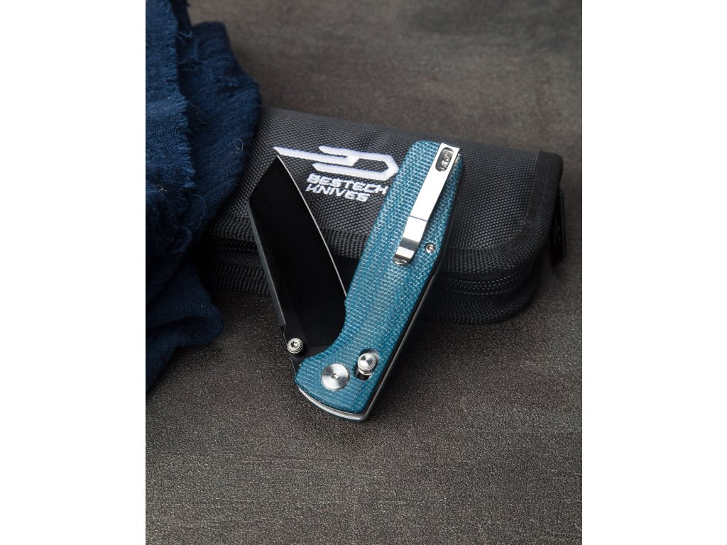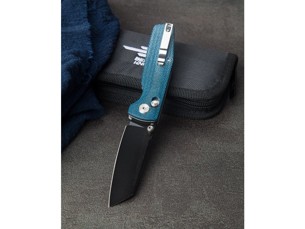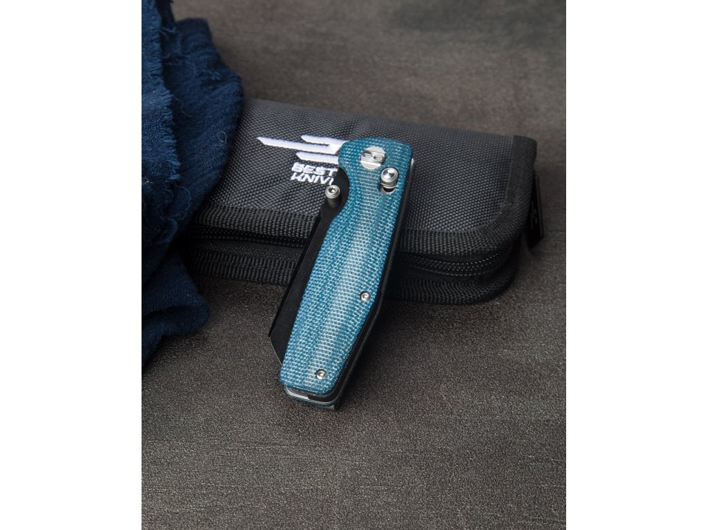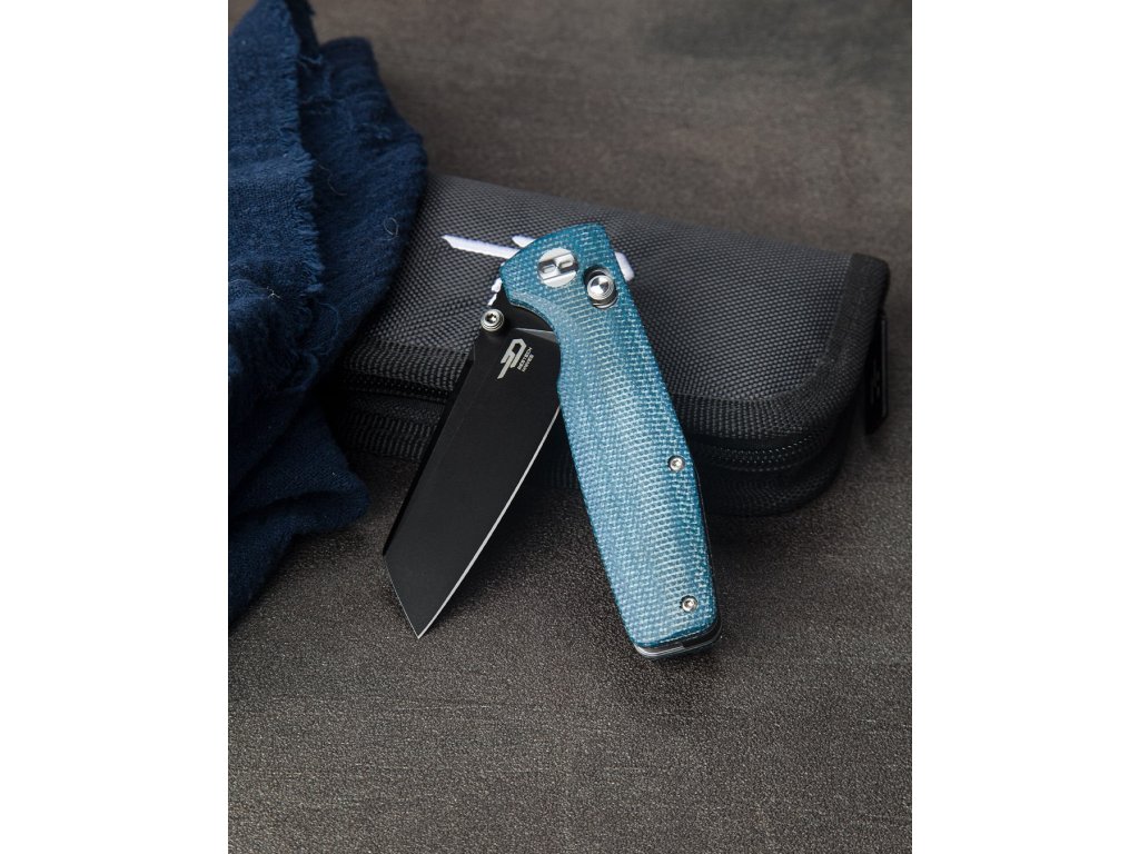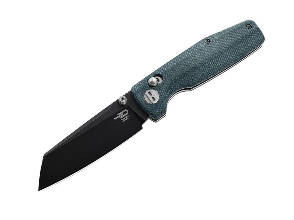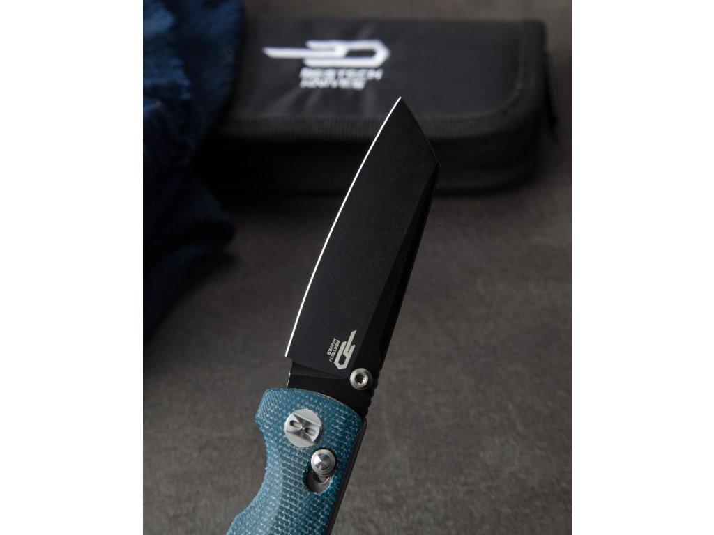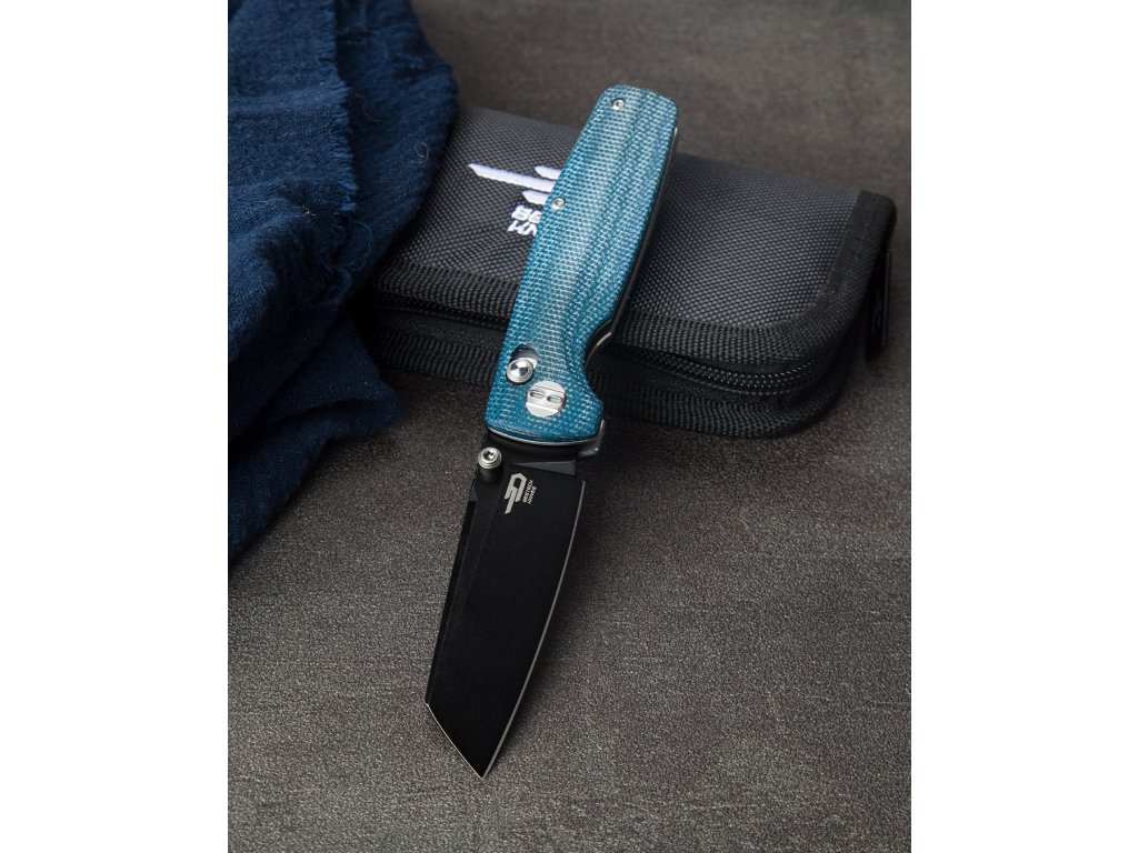Bestech Slasher BG43C-2 este un cuțit EDC cu o lamă de formă sheepfoot potrivit pentru utilizarea zilnică. Blocare a lamei tip Bar Lock (Axis). Lamei de lungime 7,8 cm este fabricată din oțel tradițional D2 cu finisaj negru stonewash și tăiș flat grind. Lamă este montată pe rulmenți ceramici, ceea ce asigură o deschidere ușoară a cuțitului. Mânerul din micarta de culoare turcoaz adaugă o notă de eleganță cuțitului. Cuțitul poate fi deschis foarte confortabil cu un singur deget (mecanism thumb stud).