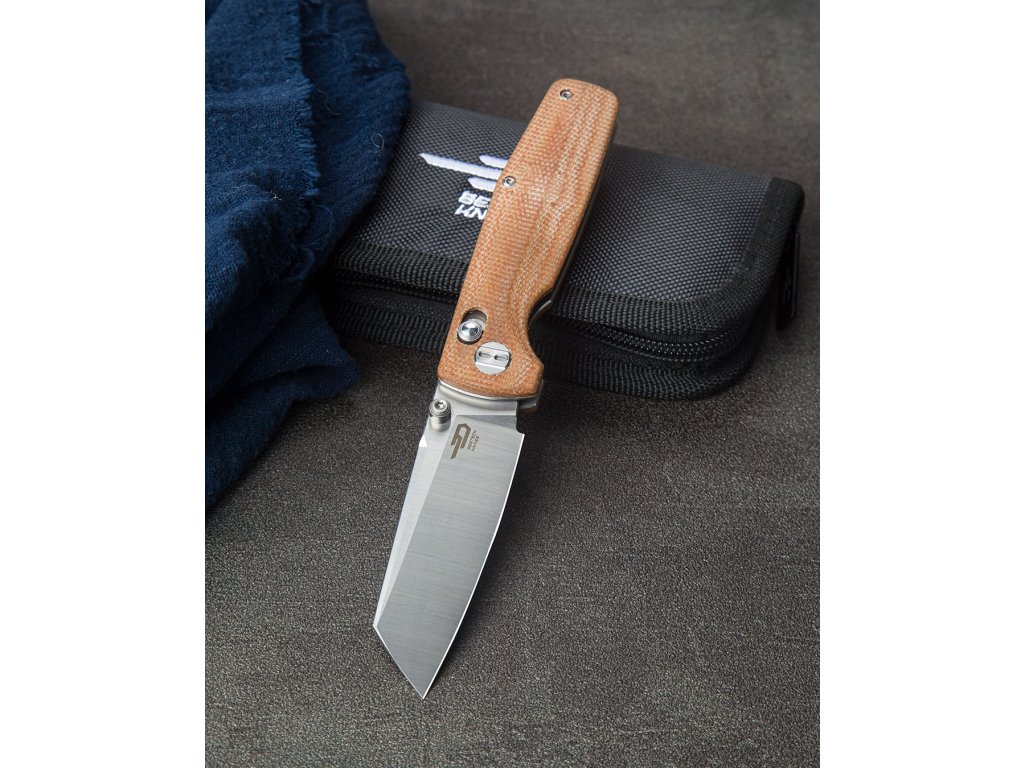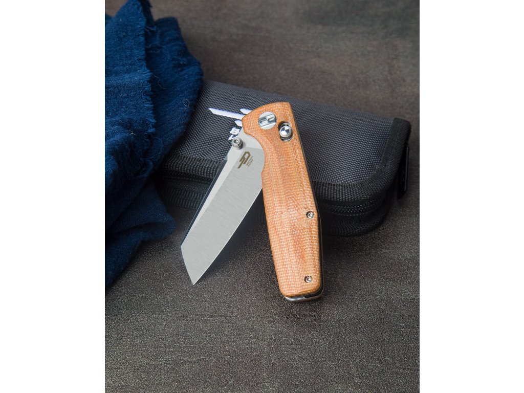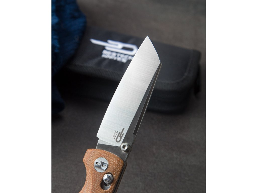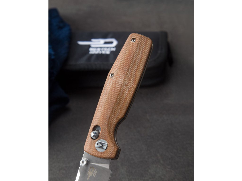 Bestech Slasher BG43D este un cuțit EDC cu o lamă de formă sheepfoot potrivit pentru utilizarea zilnică. Blocare a lamei tip Bar Lock (Axis). Lamei de lungime 7,8 cm este fabricată din oțel tradițional D2 cu finisaj satinat și tăiș flat grind. Lamă este montată pe rulmenți ceramici, ceea ce asigură o deschidere ușoară a cuțitului. Mânerul din micarta de culoare maro adaugă o notă de eleganță cuțitului. Cuțitul poate fi deschis foarte confortabil cu un singur deget (mecanism thumb stud).