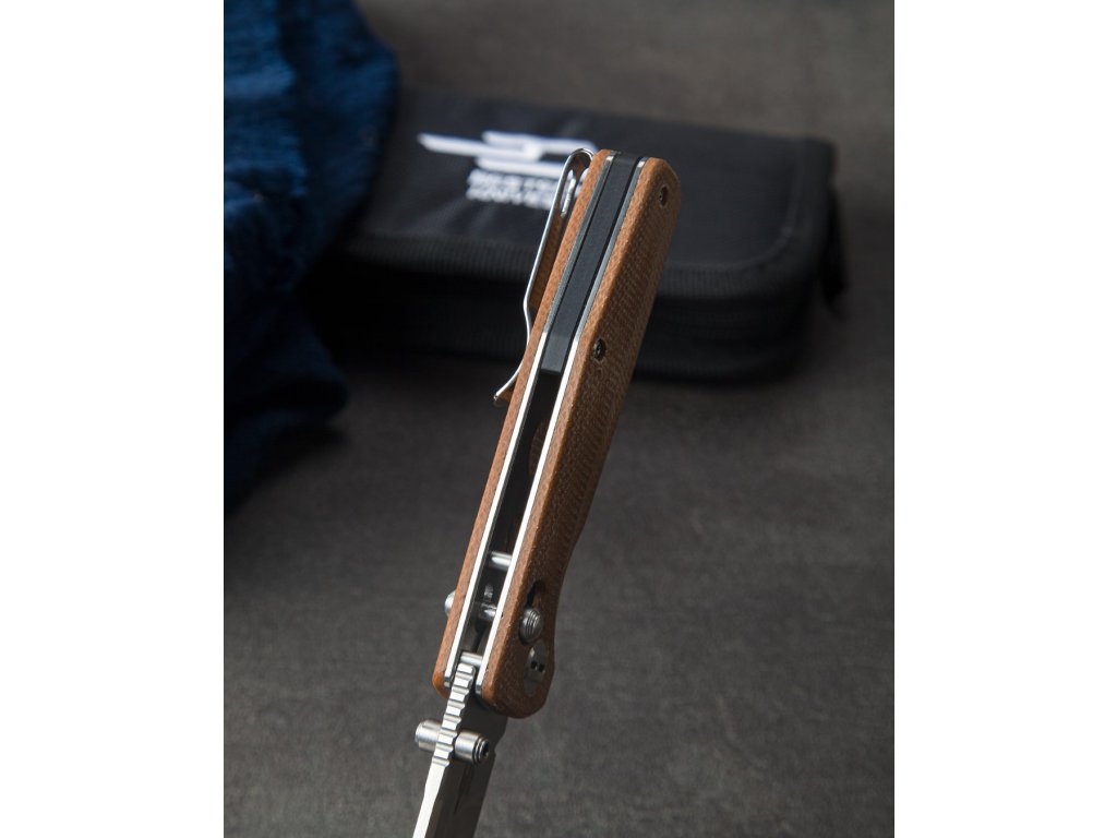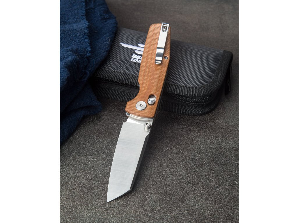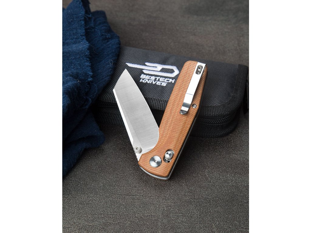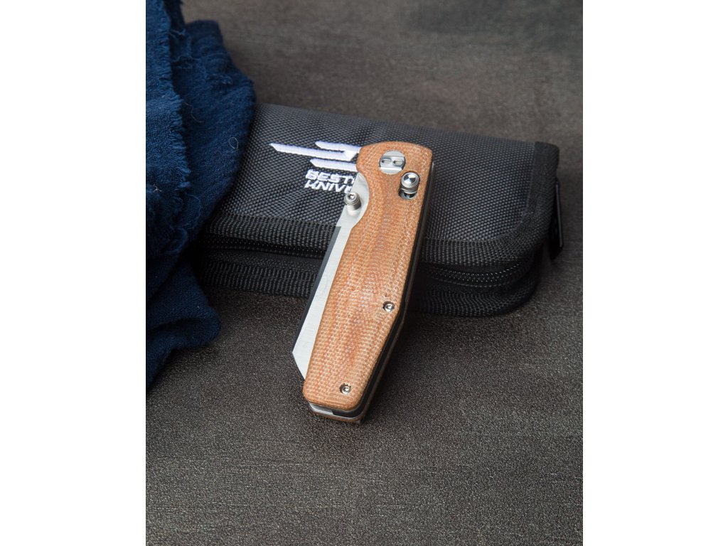 Bestech Slasher BG43D este un cuțit EDC cu o lamă de formă sheepfoot potrivit pentru utilizarea zilnică. Blocare a lamei tip Bar Lock (Axis). Lamei de lungime 7,8 cm este fabricată din oțel tradițional D2 cu finisaj satinat și tăiș flat grind. Lamă este montată pe rulmenți ceramici, ceea ce asigură o deschidere ușoară a cuțitului. Mânerul din micarta de culoare maro adaugă o notă de eleganță cuțitului. Cuțitul poate fi deschis foarte confortabil cu un singur deget (mecanism thumb stud).