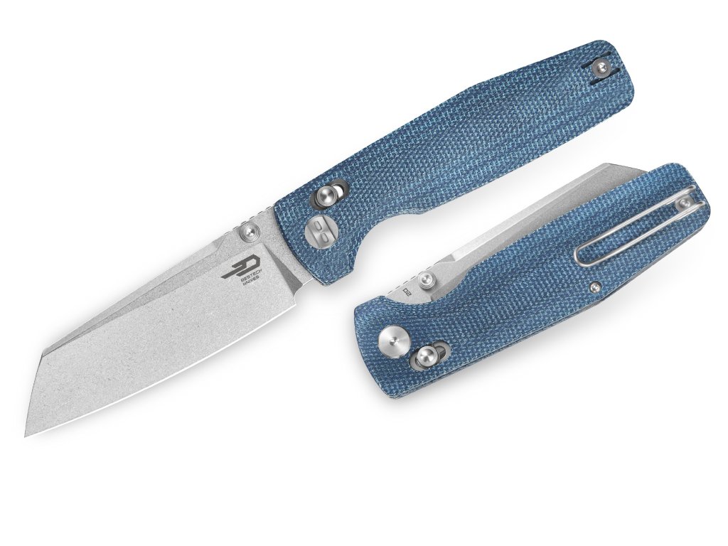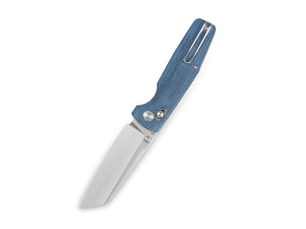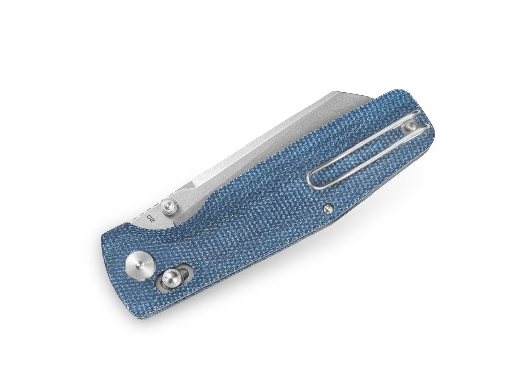 Cuțit de buzunar de mărime medie, conceput pentru utilizare zilnică. Lama este fabricată din oțel D2, cu tăiș flat grind, are o lungime de 8,9 cm și este montată pe rulmenți ceramici. Finisaj stonewash. Mâner din Micarta albastră cu textură pentru o prindere fermă. Cuțitul este echipat cu un o blocare a lamei de tip bar lock și o clemă din oțel pentru agățare. Deschidere cu o singură mână cu un știft pentru degetul mare pe lamă.