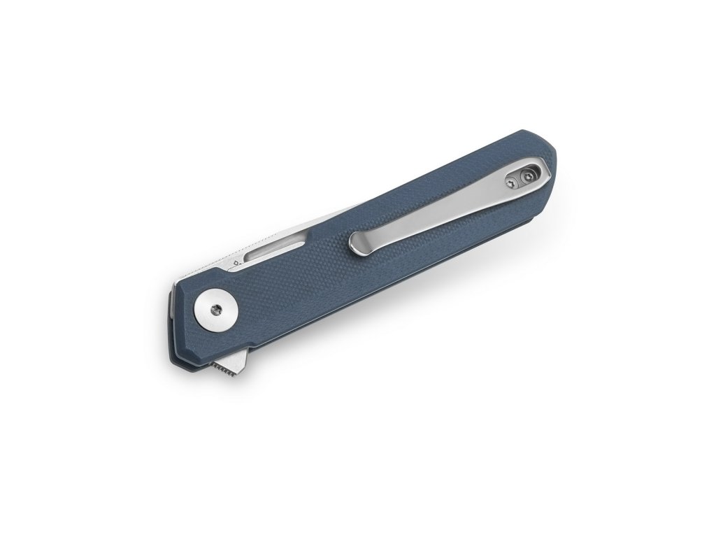 Mânerul din G10 gri-albastru este fin texturat și se simt confortabil în mână. Mini Dundee are o blocare a lamei tip Liner Lock și o clemă pentru agățare. Lama se mișcă foarte ușor și lin datorită rulmenților ceramici. Un singur deget este tot ce vă trebuie pentru a îl deschide folosind un flipper, deschiderea este confortabilă și rapidă.