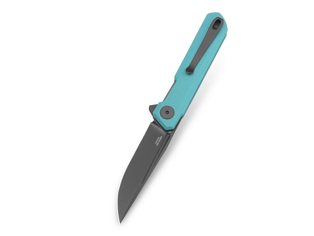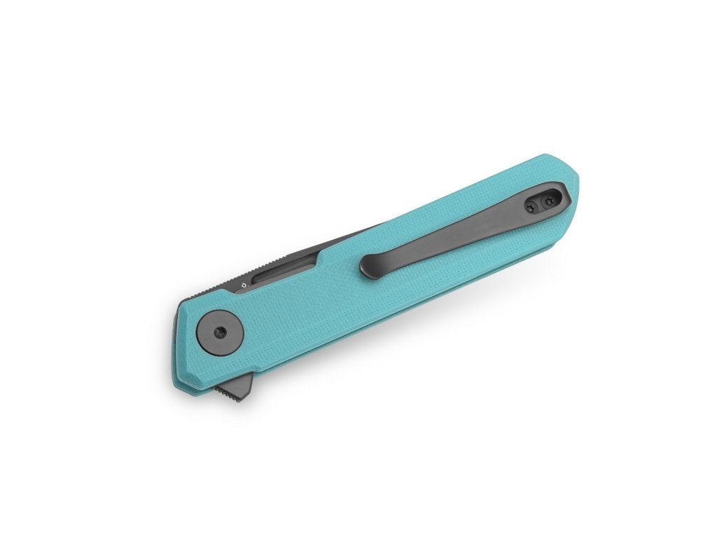 Mânerul din G10 albastru deschis este fin texturat și se simt confortabil în mână. Mini Dundee are o blocare a lamei tip Liner Lock și o clemă pentru agățare. Lama se mișcă foarte ușor și lin datorită rulmenților ceramici. Un singur deget este tot ce vă trebuie pentru a îl deschide folosind un flipper, deschiderea este confortabilă și rapidă.