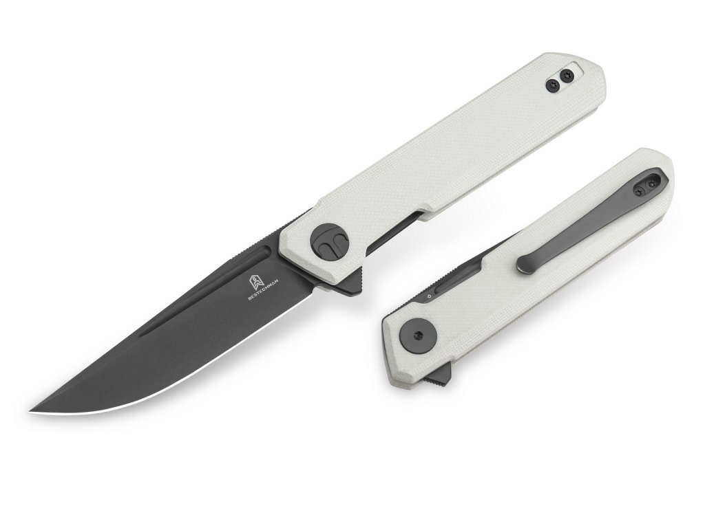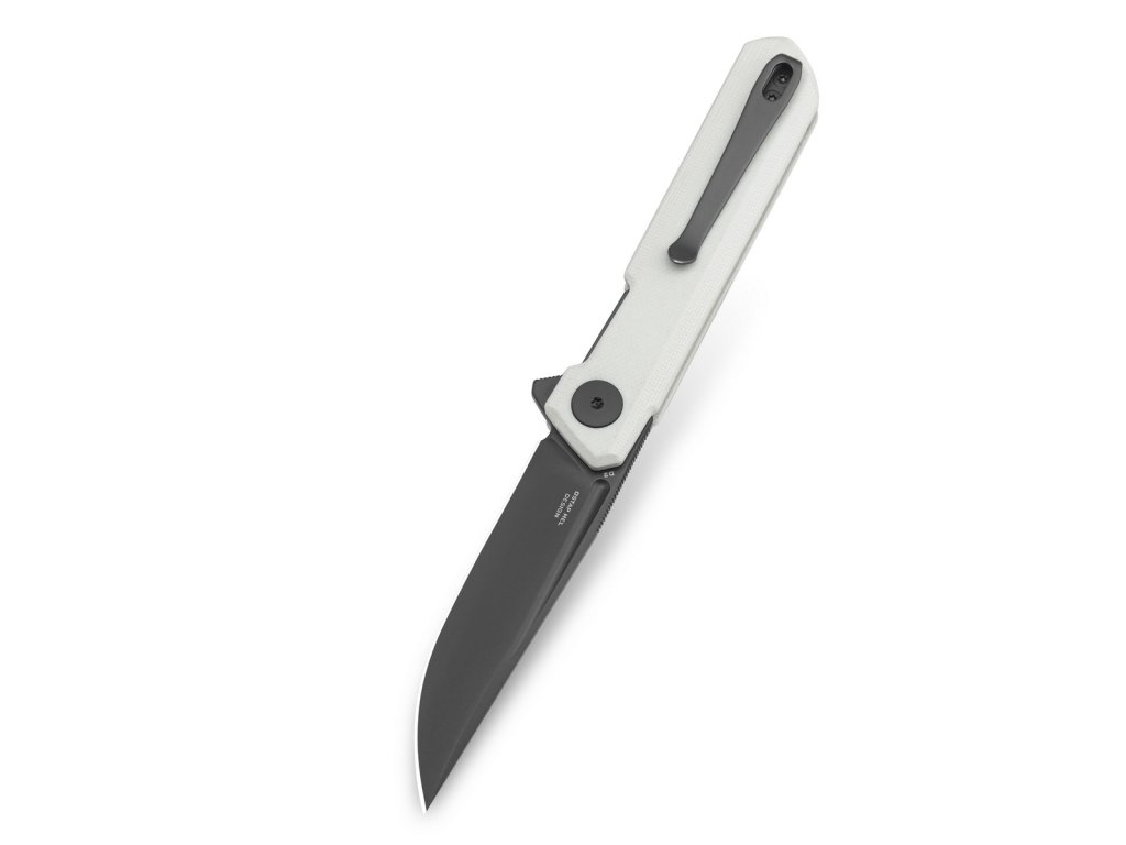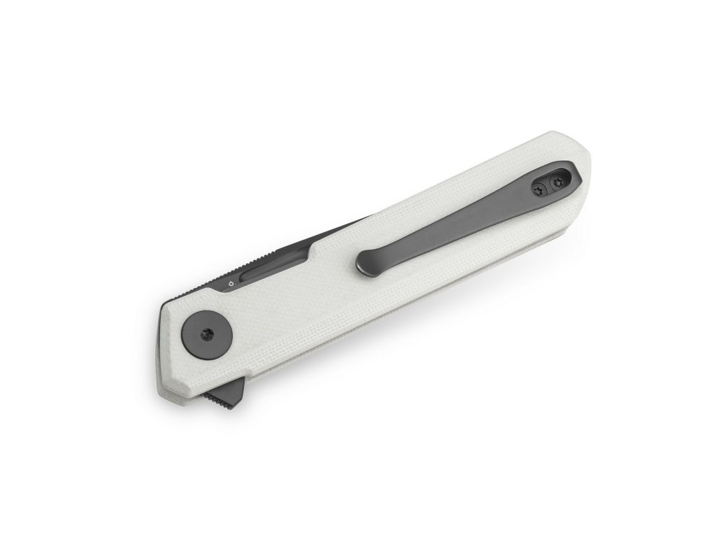 Mânerul din G10 alb-crem este fin texturat și se simt confortabil în mână. Mini Dundee are o blocare a lamei tip Liner Lock și o clemă pentru agățare. Lama se mișcă foarte ușor și lin datorită rulmenților ceramici. Un singur deget este tot ce vă trebuie pentru a îl deschide folosind un flipper, deschiderea este confortabilă și rapidă.