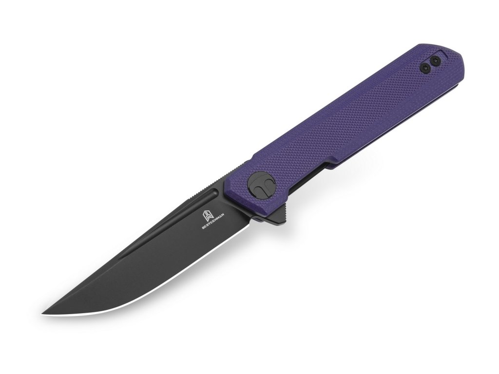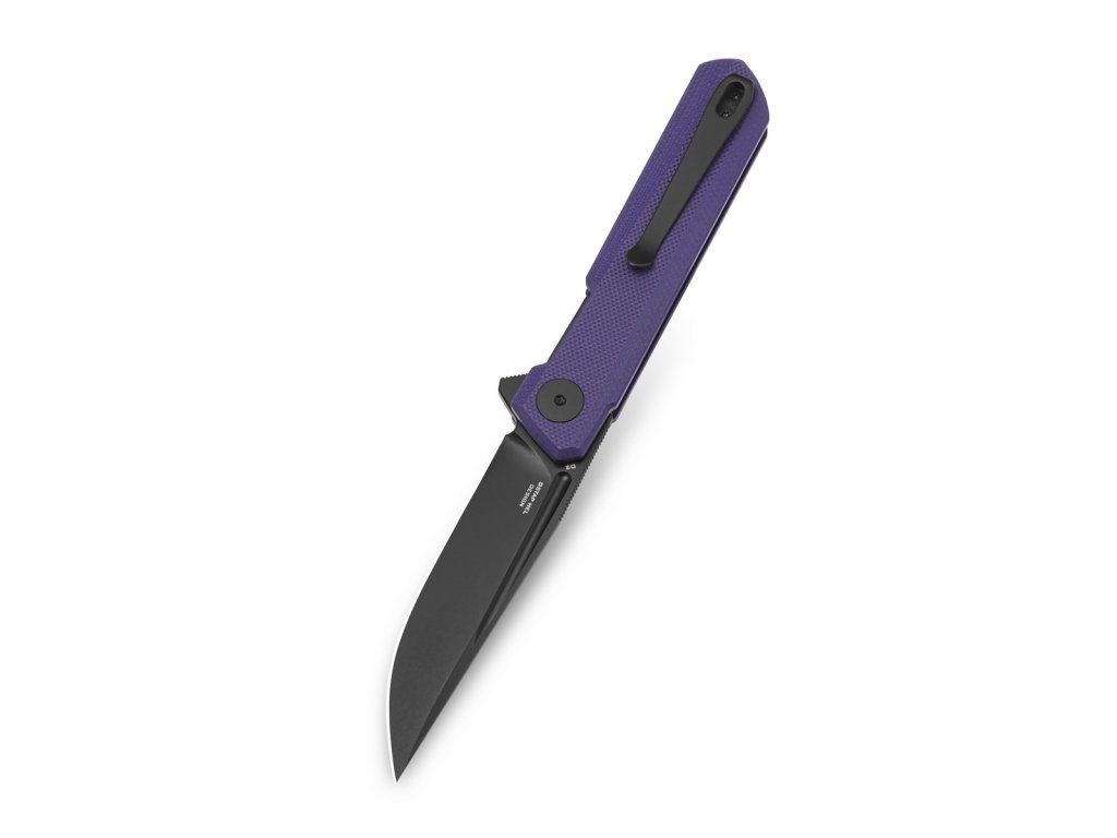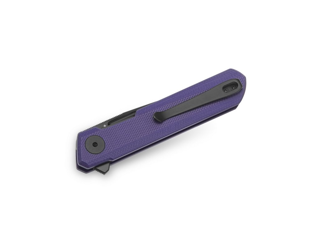 Mânerul din G10 violet este fin texturat și se simt confortabil în mână. Mini Dundee are o blocare a lamei tip Liner Lock și o clemă pentru agățare. Lama se mișcă foarte ușor și lin datorită rulmenților ceramici. Un singur deget este tot ce vă trebuie pentru a îl deschide folosind un flipper, deschiderea este confortabilă și rapidă.