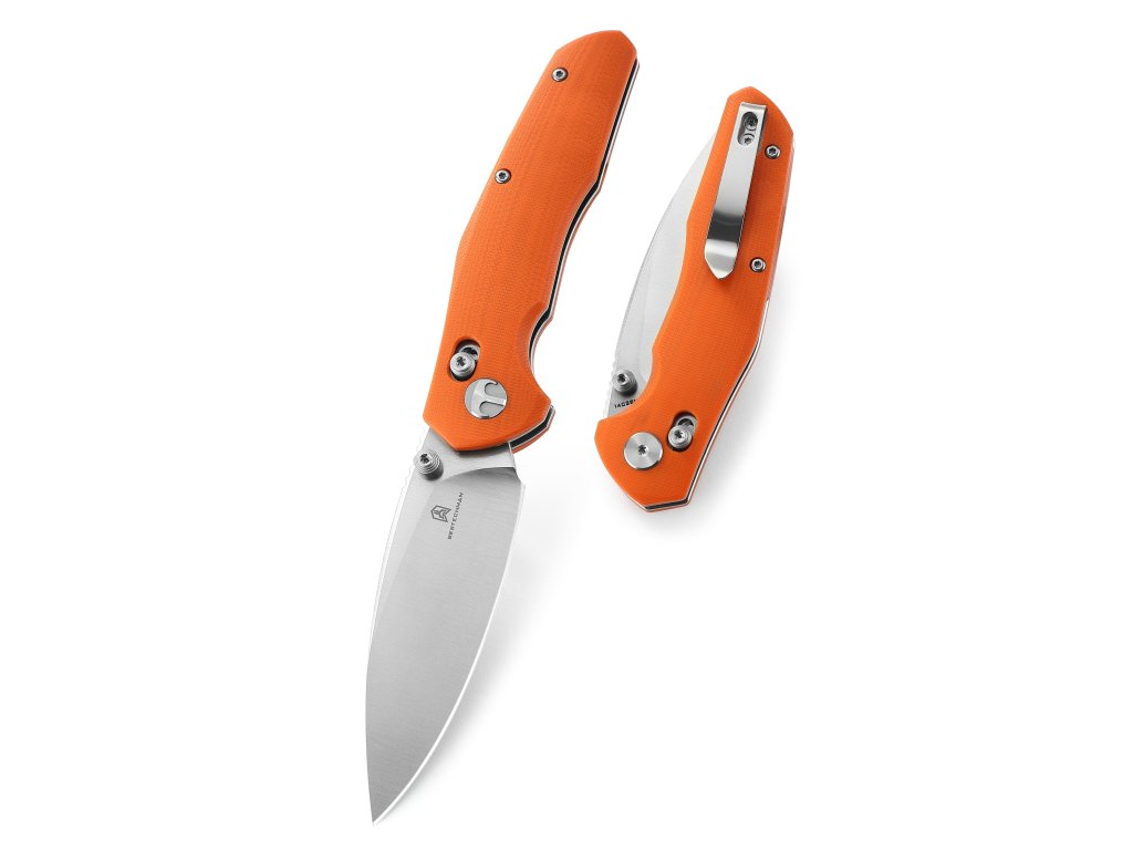 Bestechman Ronan BMK02C este un cuțit EDC de la producătorul renumit Bestech. Cuțitul de buzunar este ideal pentru utilizare zilnică și îl puteți lua cu dvs. oriunde mergeți. Lama de lungime 8,3 cm, în formă de drop point, este fabricată din oțel inoxidabil Sandvik 14C28N. Mânerul G10 portocaliu asigură o prindere confortabilă. Are un un finisaj satinat clasic. Cuțitul pliabil este echipat cu o blocare a lamei tip bar lock și o clemă mică pentru agățare.