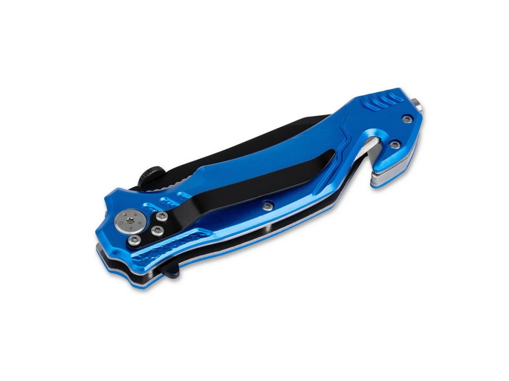 Cuțit pliabil de salvare. Lama parțial zimțată, cu o lungime de 8,3 cm, fabricată din oțel inoxidabil 440A cu finisaj negru, are un tăiș hollow grind. Cuțitul se deschide folosind un flipper sau o rotiță de pe partea superioară a lamei. Deschiderea este facilitată de un arc integrat în mânerul cuțitului. Acest lucru face ca deschiderea cuțitului să fie foarte rapidă și confortabilă.