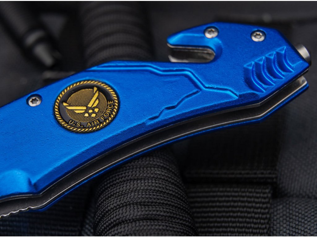 Mânerul din aluminiu anodizat albastru este extrem de rezistent și este decorat cu un simbol al aviației. Cuțitul este echipat cu o clemă de buzunar, un dispozitiv pentru tăierea centurii de siguranță și un vârf pentru spargerea sticlei, care pot fi de mare ajutor în situații de urgență.