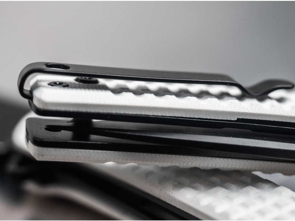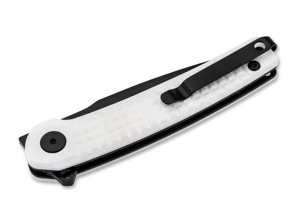 Cuțit pliabil. Lamă din oțel inoxidabil 440B, de lungime 8,1 cm. Lungime totală 19,1 cm. Mâner alb din G10. Blocare a lamei Liner Lock.