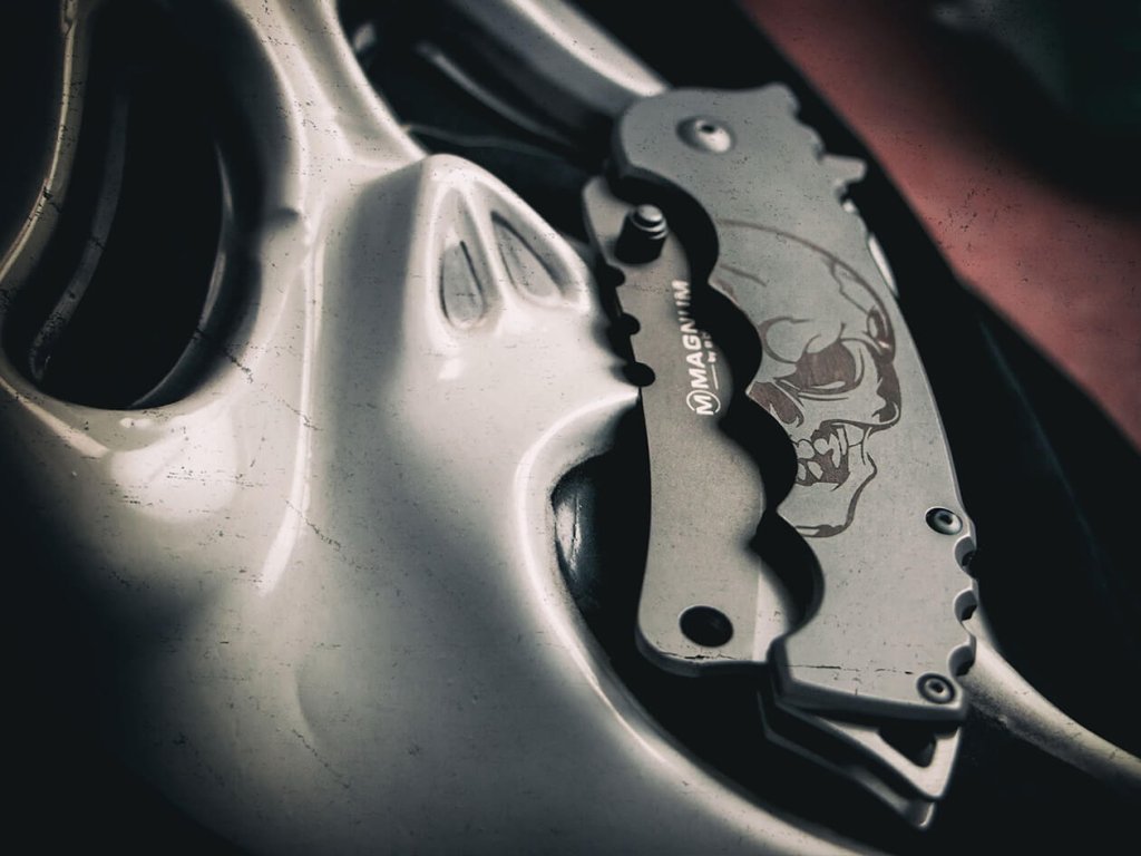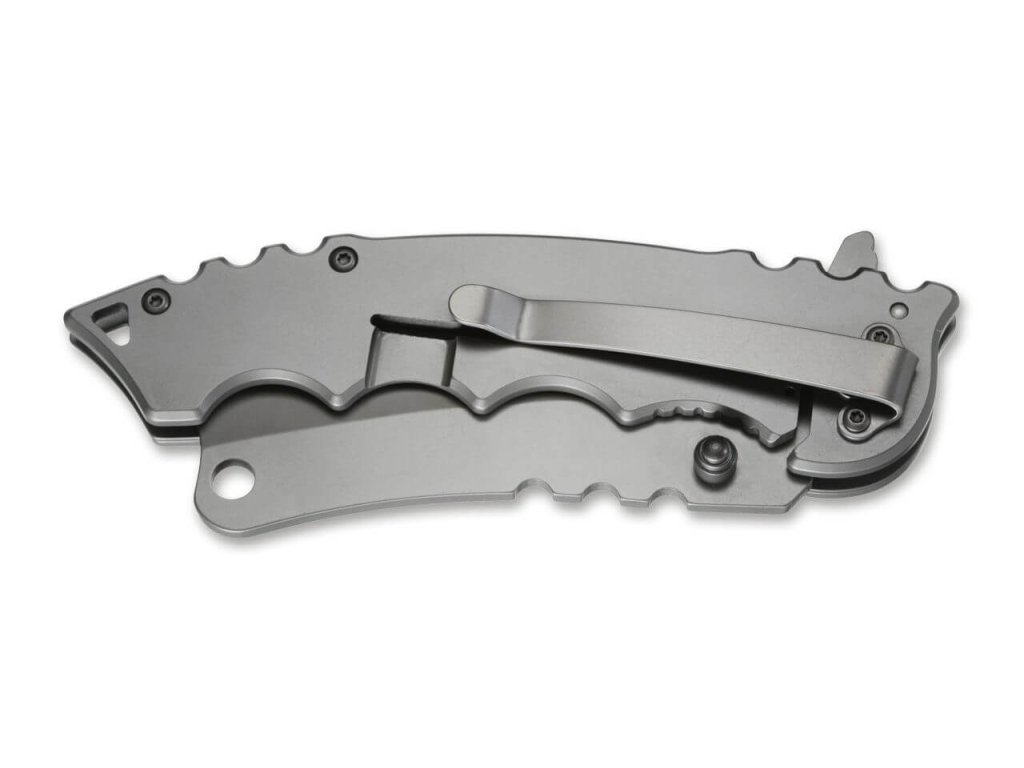 Cuțit de buzunar cu formă neobișnuită a lamei, fabricat din oțel inoxidabil 440A. Finisajul lamei este gri și are un tăiș hollow grind. Mânerul cu motiv de craniu este de asemenea fabricat din oțel inoxidabil. Puteți alege să deschideți cuțitul cu un flipper sau cu un știft cu două fețe. Blocare a lamei tip frame lock. Cuțitul este echipat cu o clemă tip-down.
