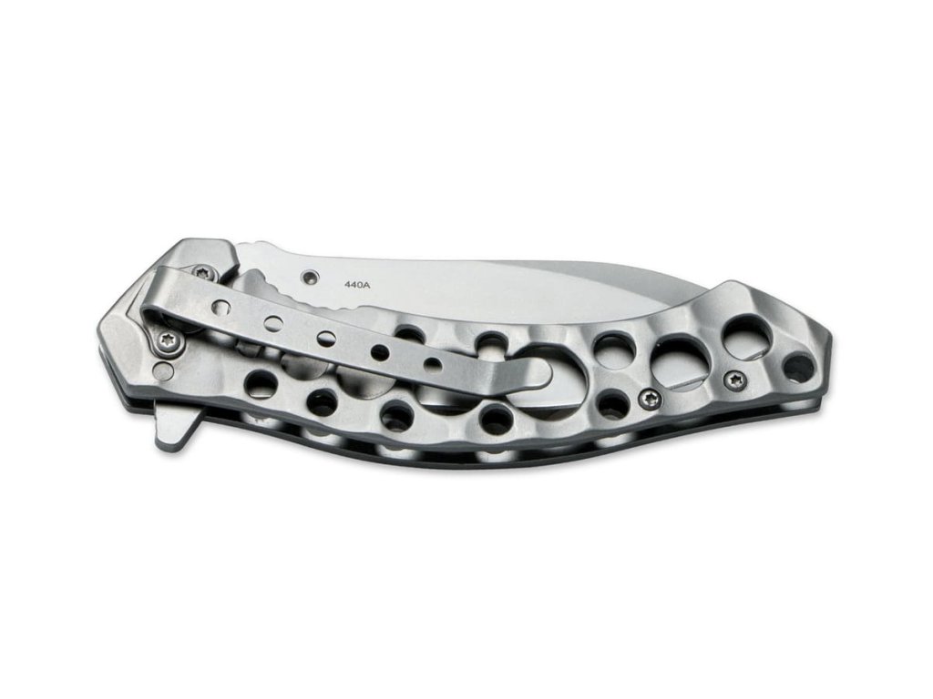 Cuțit elegant Böker cu o gamă largă de utilizări. Lama are lungimea de 8,8 cm și este fabricat din oțel inoxidabil 440A. Mânerul perforat din oțel inoxidabil cu model încrucișat conferă cuțitului un aspect premium. Blocare tip Frame Lock. Clemă pentru agățare.