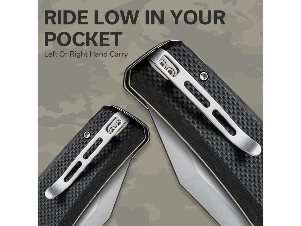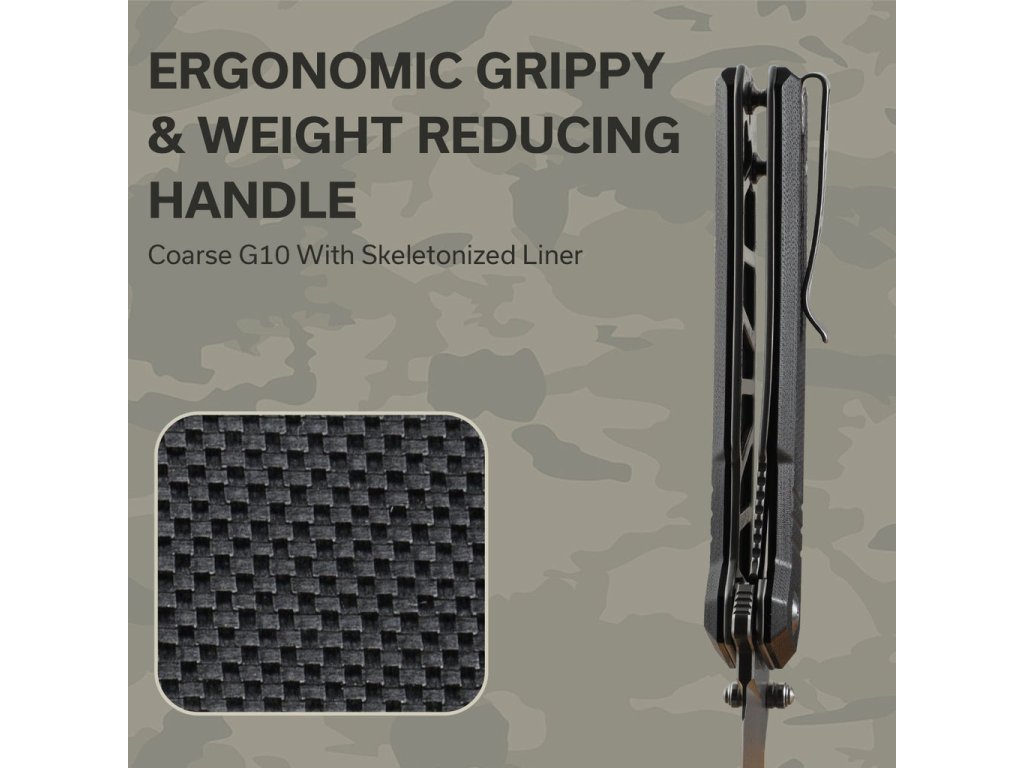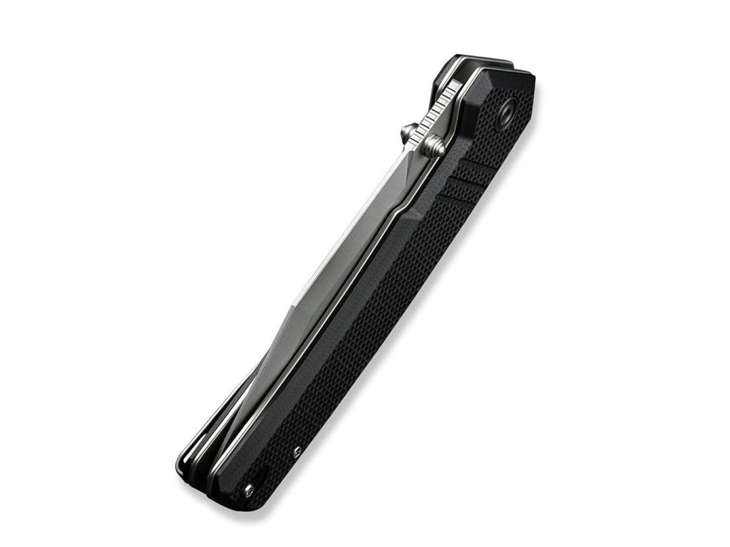 Deschis, cuțitul are o lungime totală de 23,2 cm, închis, 13,1 cm. Acești 13,1 cm se simt tangibil în mânerul G10 de culoare neagră, care este confortabil și permite o prindere fermă. Mânerul include și o clemă Tip-Up pentru agățare, greutate doar 166 g.