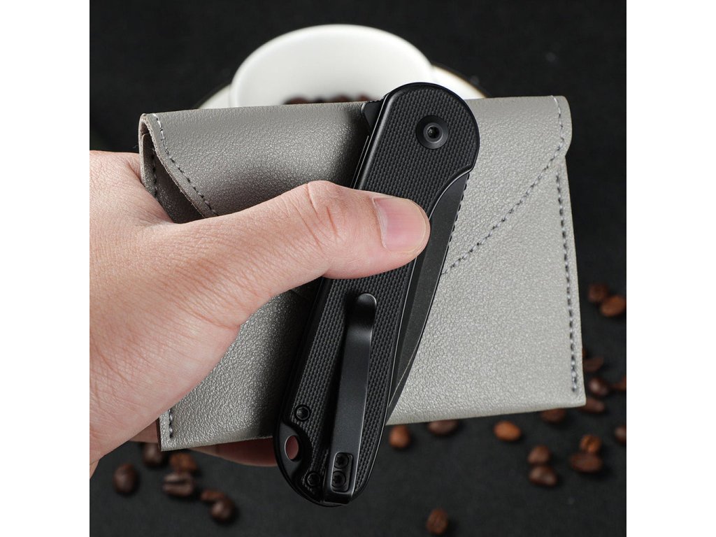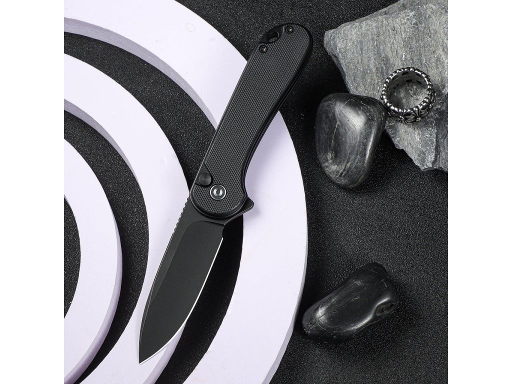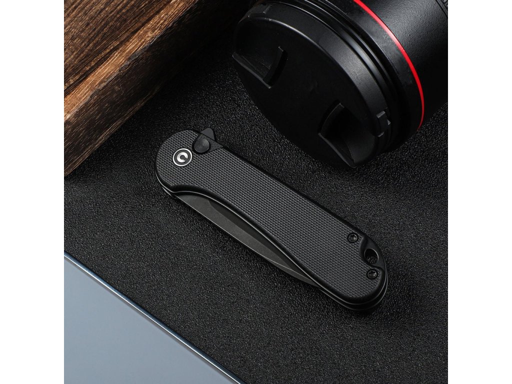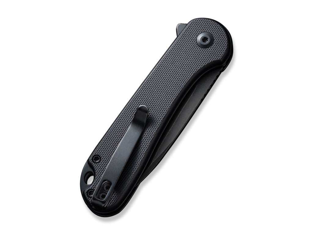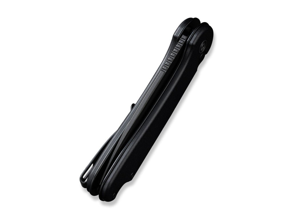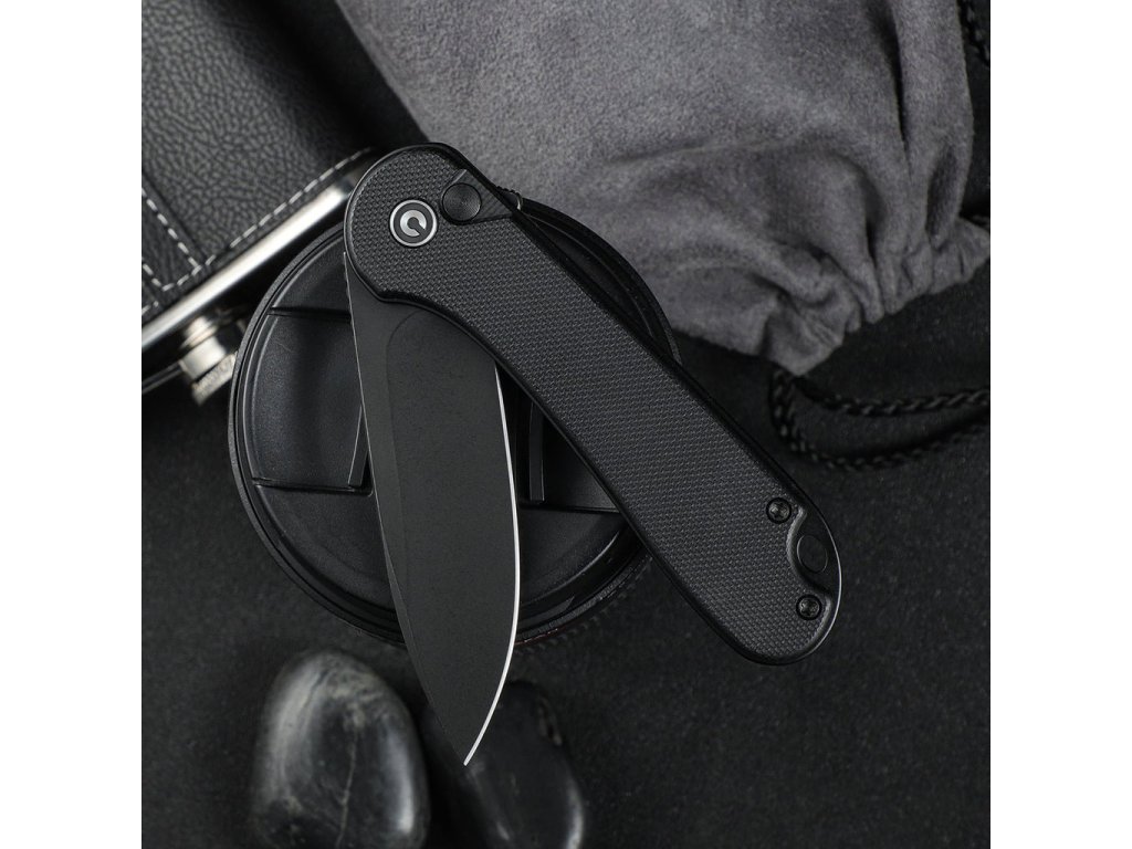 Lama de 7,5 cm este fabricată din oțel inoxidabil Nitro-V cu finisaj stonewash negru, are o formă de drop point. Blocarea cuțitului este foarte confortabilă datorită butonului de blocare. Mânerul din G10 negru asigură o prindere confortabilă. Lama este montată pe rulmenți ceramici. Greutatea cuțitului este de 88,5 g.