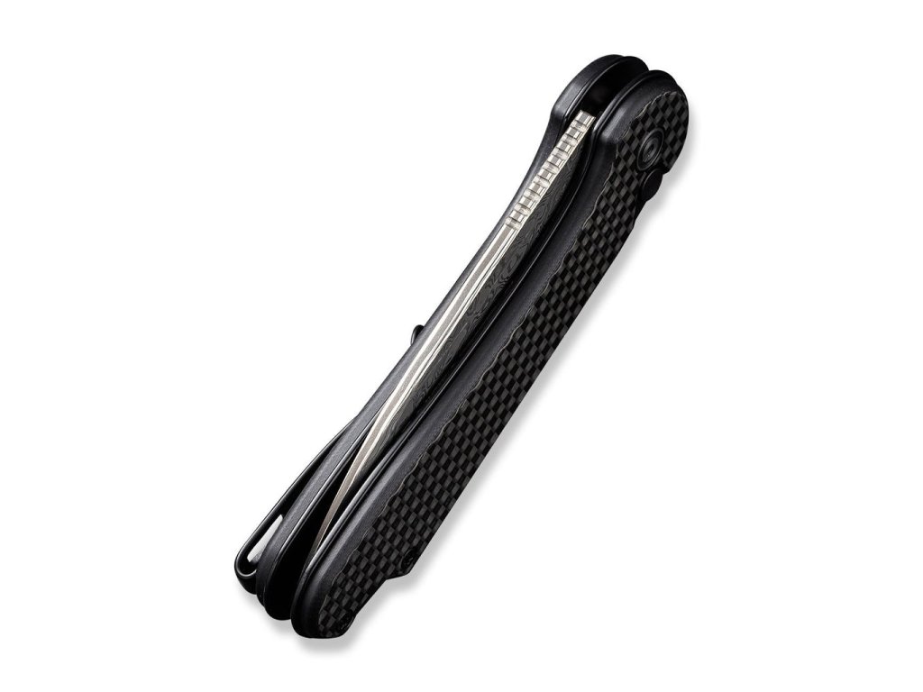 Lama în formă de drop point, cu lungimea de 7,5 cm, este fabricată din oțel de Damasc de calitate, cu tăiș flat grind. Oțelul de Damasc inoxidabil are un aspect foarte elegant datorită modelului stilat. Mânerul este fabricat din G10 cu un strat superior din fibră de carbon de culoare neagră.