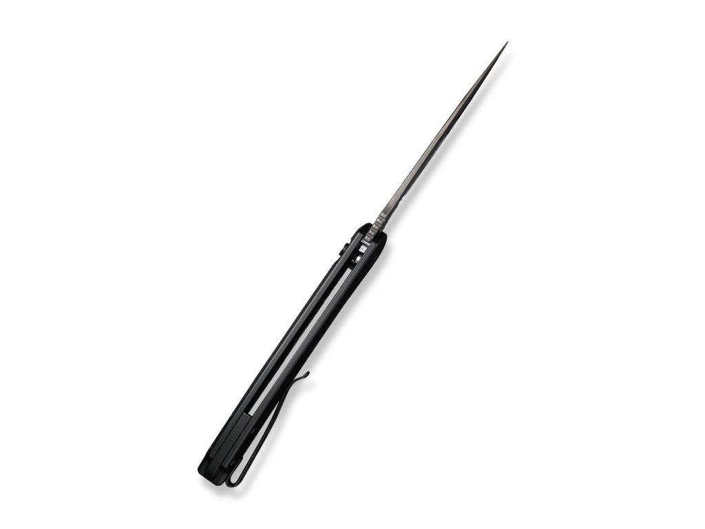 Lama, de 9,5 cm lungime, este realizată din oțel de Damasc de calitate și are o formă drop point. Blocarea lamei este foarte comodă datorită butonului de blocare. Mânerul este fabricat din aluminiu de culoare neagră.
