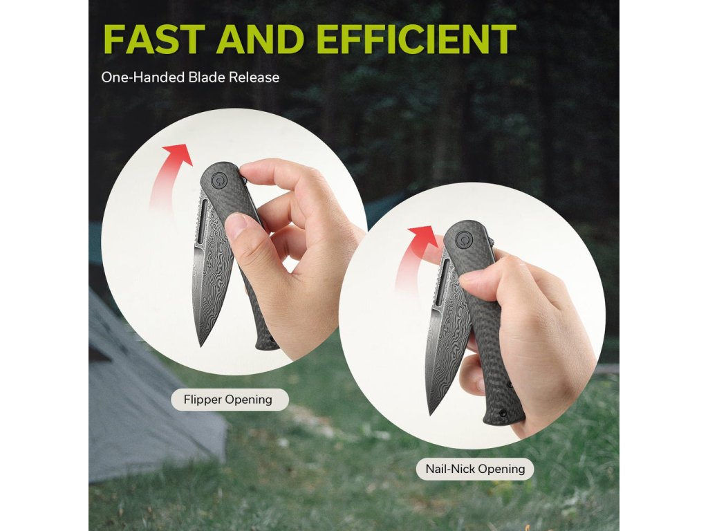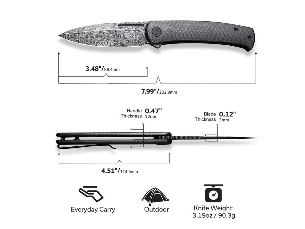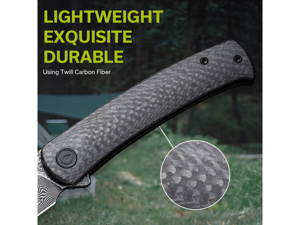 Mânerul este fabricat din fibră de carbon. Forma și lungimea acestuia vă oferă o prindere confortabilă și fermă, care nu vă va obosi mâna. Cuțitul are o greutate de 90 g și este prevăzut cu o clemă Tip-Up pentru agățare, astfel încât transportul său este foarte practic și simplu. Încercați cuțitele EDC Civivi Caetus, ce combină stilul, funcționalitatea și sunt gata să vă asiste în aventurile dvs. de zi cu zi.