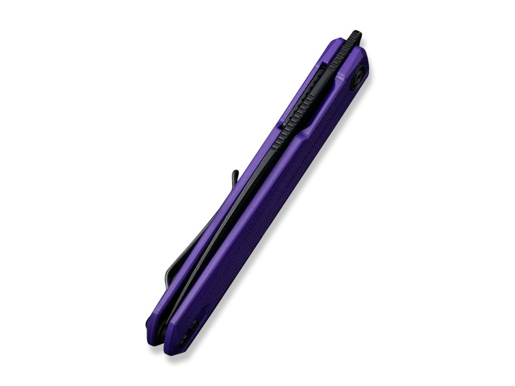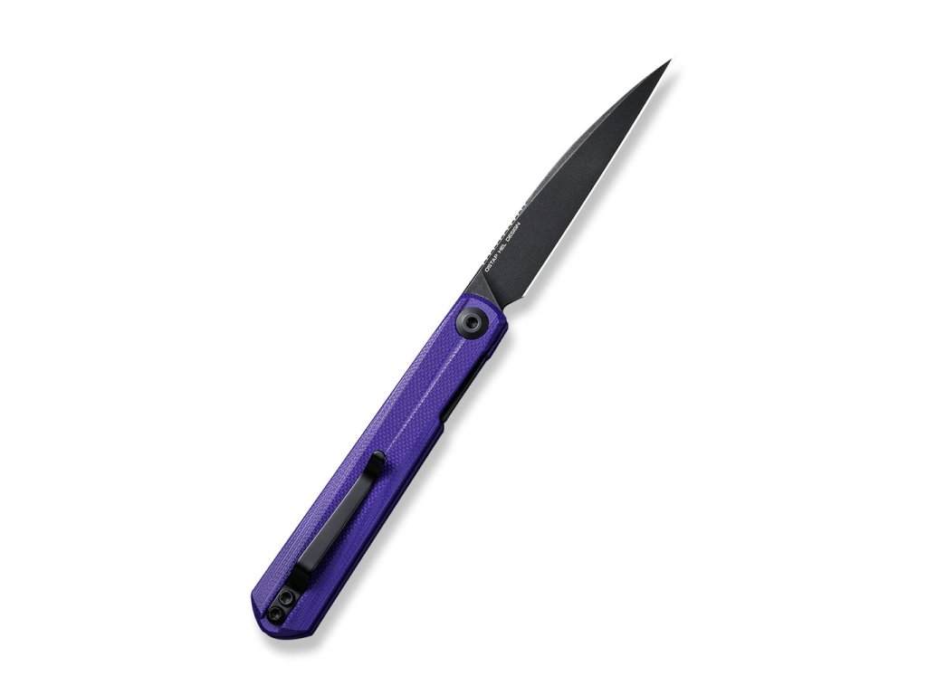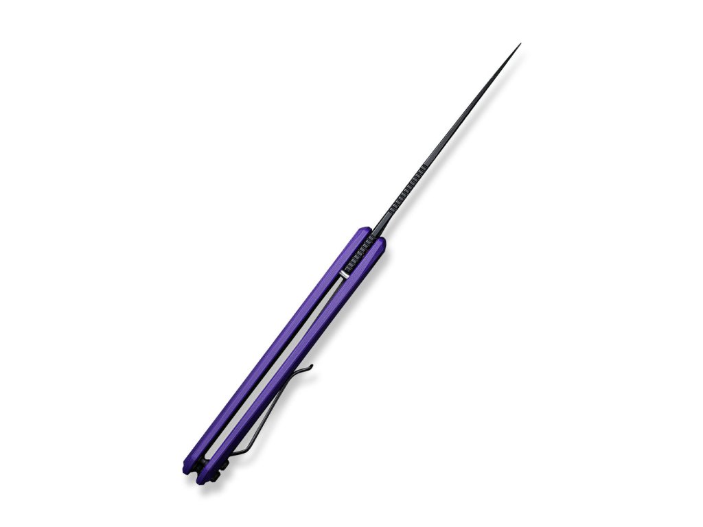 Cuțitul pliabil Civivi Clavi C21019-2 este un instrument excelent pentru utilizare zilnică. La prima vedere, vă va atrage atenția aspectul său neobișnuit, cu lama foarte îngustă și vârful ascuțit. Lama, de 7,7 cm lungime, este realizată din oțel inoxidabil Nitro-V și are o formă wharncliffe și un finisaj stonewash negru. Cuțitul are un mecanism de blocare a lamei liner lock. Mânerul este fabricat din material G-10 de culoare violet interesantă. Cuțitul poate fi deschis rapid cu o singură mână cu ajutorul unui flipper frontal. Deschiderea cuțitului este foarte ușoară și lină, lama este așezată pe rulmenți ceramici. Cuțitul are o clemă din oțel inoxidabil pentru agățare.