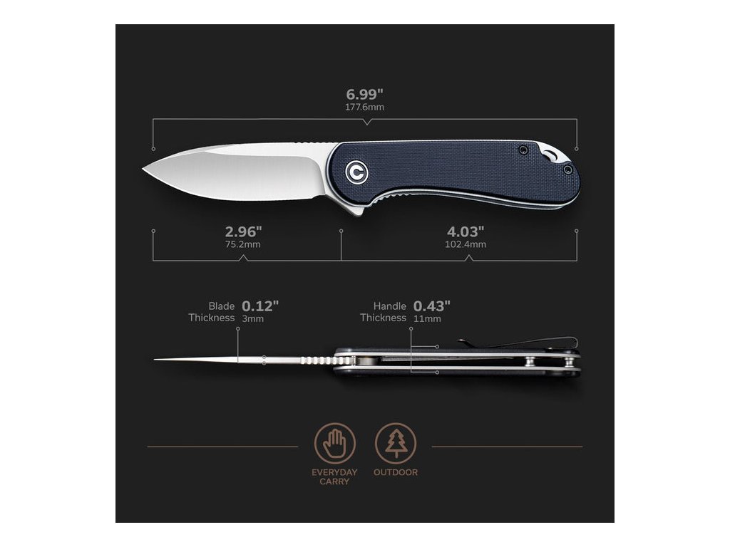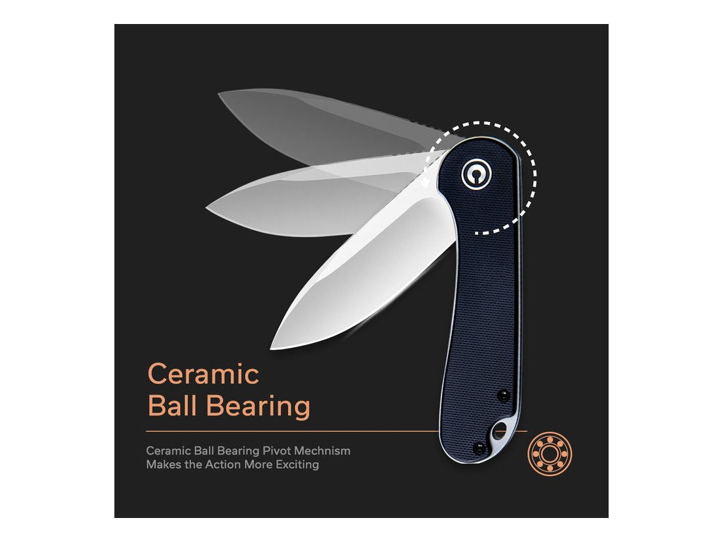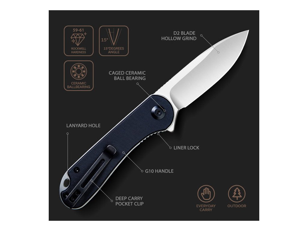 Cuțit pliabil care impresionează prin designul său simplu și calitatea execuției. Civivi Elementum este un cuțit EDC mai mic, elegant, cu o notă de lux. Lama din oțel pentru unelte D2 are un finisaj mat și tăiș tip hollow grind. Blocare a lamei tip Liner Lock. Mâner din oțel inoxidabil cu aplice din G10 de culoare neagră. Clemă din oțel inoxidabil pentru agățarea cuțitului. Deschidere cu o singură mână asigurată de un flipper. Deschiderea cuțitului este foarte ușoară și lină, lama este montată pe rulmenți ceramici.