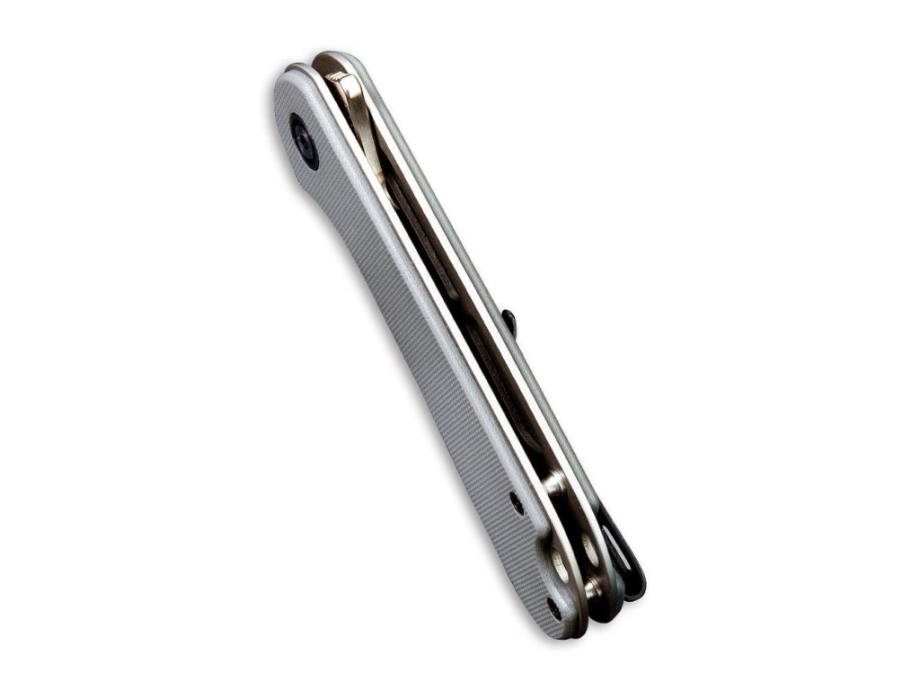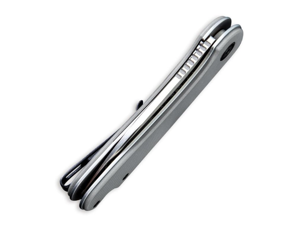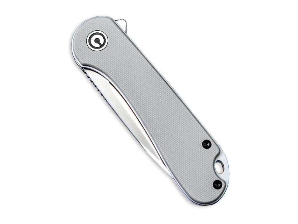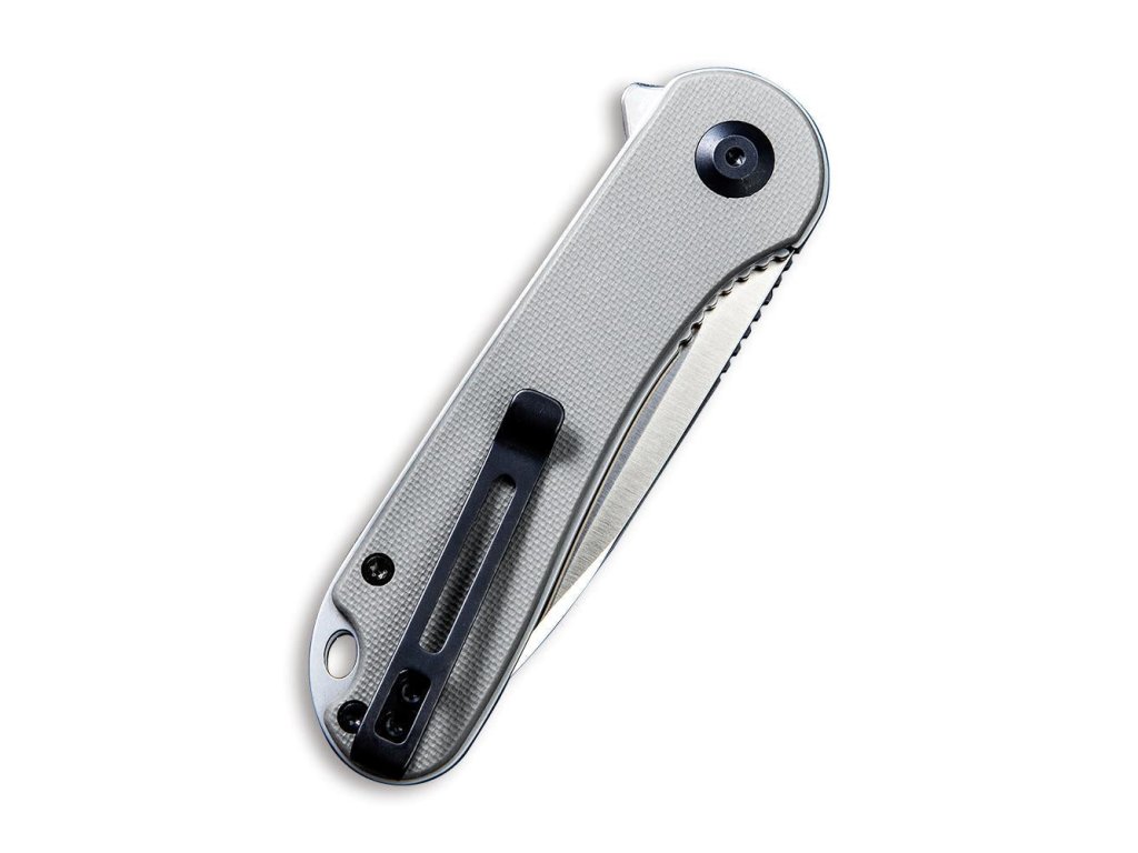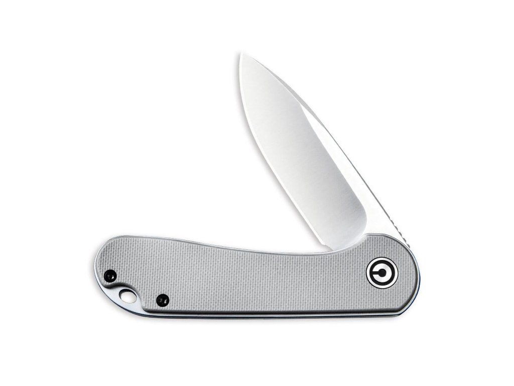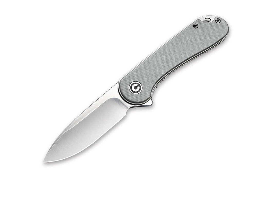 Cuțit pliabil care impresionează prin designul simplu și calitatea execuției. Civivi Elementum este un cuțit EDC mai mic, elegant, cu o notă de lux. Lama, din oțel pentru unelte D2, are un finisaj satinat și un tăiș hollow grind. Blocare a lamei de tip liner lock. Mâner din G10 gri. Clemă pentru agățarea cuțitului din oțel inoxidabil. Deschiderea cu o singură mână este asigurată de un flipper. Deschiderea cuțitului este foarte ușoară și lină, lama este montată pe rulmenți ceramici.