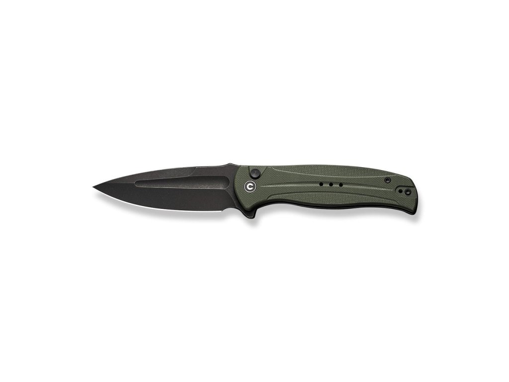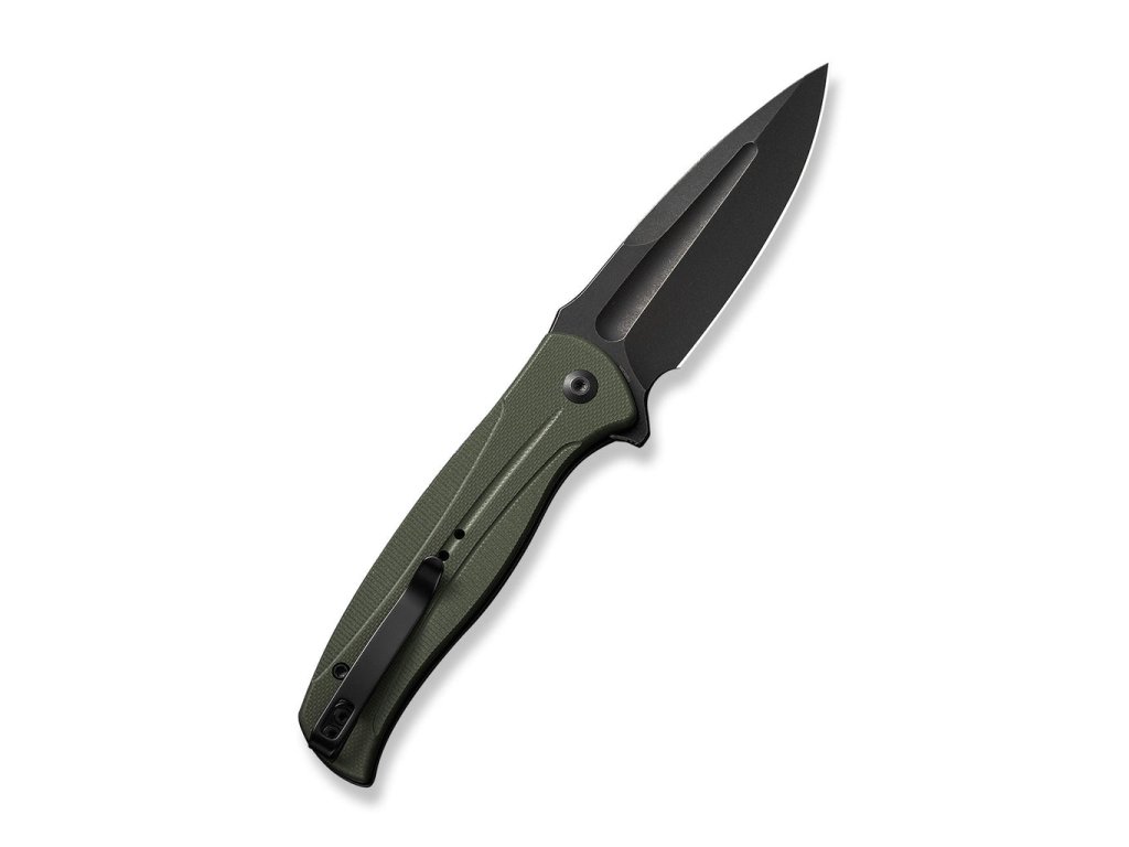 Mânerul cu lungimea de 11,3 cm este fabricat din G10 verde și garantează o prindere confortabilă, care nu va obosi mâna. Se deschide cu ajutorul unui flipper sau buton. Blocare a lamei tip button lock, ce exclude deschiderea accidentală. Cuțitul are rulmenți ceramici cu bile, care asigură o funcționare lină și durabilă a cuțitului.