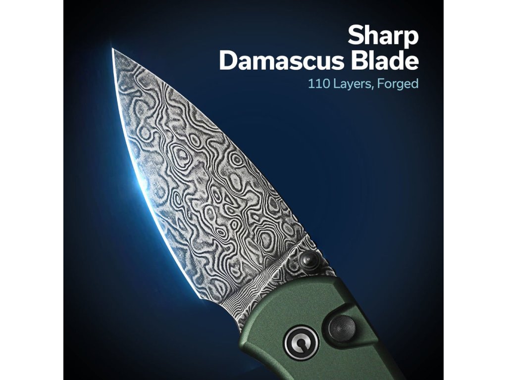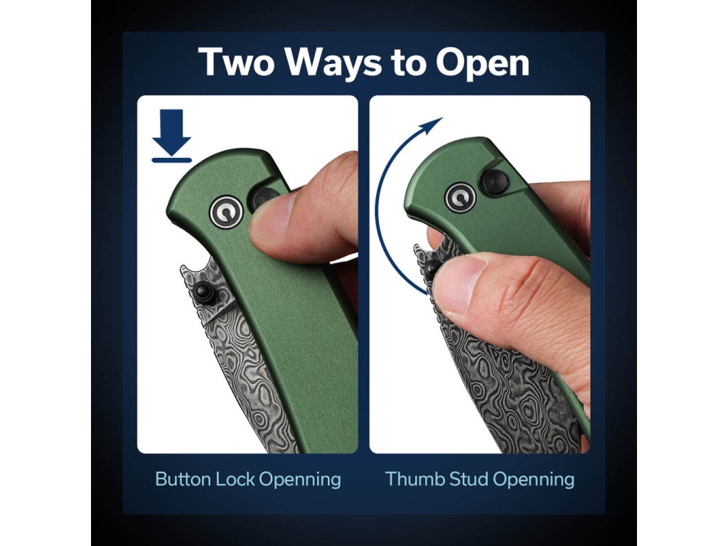 Vă prezentăm un cuțit EDC practic, frumos și fiabil - Civivi Qubit. Qubit Damascus are o lungime totală de 18,3 cm, Lama Damasc are lungimea de 7,6 cm și grosimea de 2,3 mm, o formă drop point și un finisaj hand rubbed. Duritate 58 - 60 HRC. Cuțitul are tăiș flat grind. Lama se deschide cu ajutorul unui buton sau a unui știft pentru degetul mare (thumb stud). Este blocată în poziție deschisă de un sistem de blocare tip buton lock. Rețineți că blocarea lamei este realizată cu un arc sub buton, care asigură o tensiune adecvată, astfel încât să existe o rezistență suficientă pentru a preveni deschiderea accidentală.