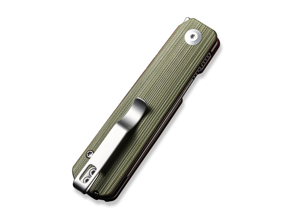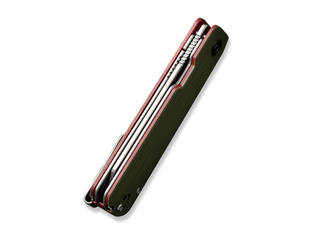 Mânerul este fabricat din G10 bicolor. Clema pentru agățarea cuțitului este realizată din oțel inoxidabil. Deschiderea cu o singură mână este asigurată de un in-line flipper. Deschiderea cuțitului este foarte ușoară și lină, lama fiind așezată pe rulmenți ceramici.