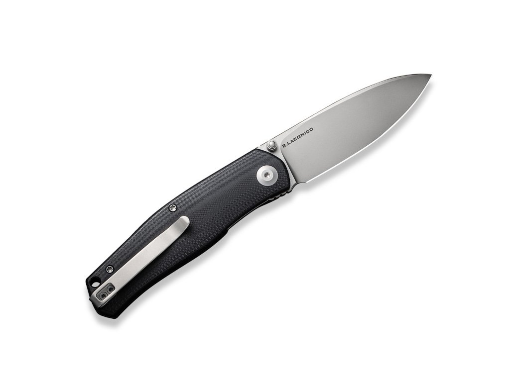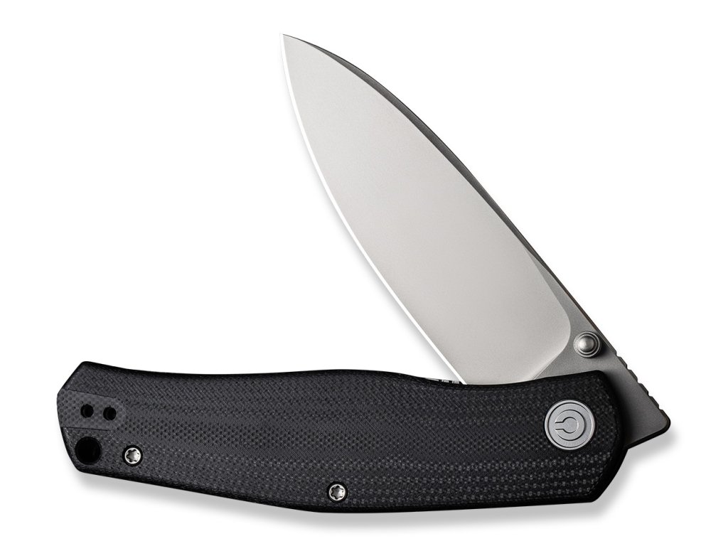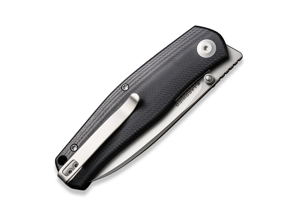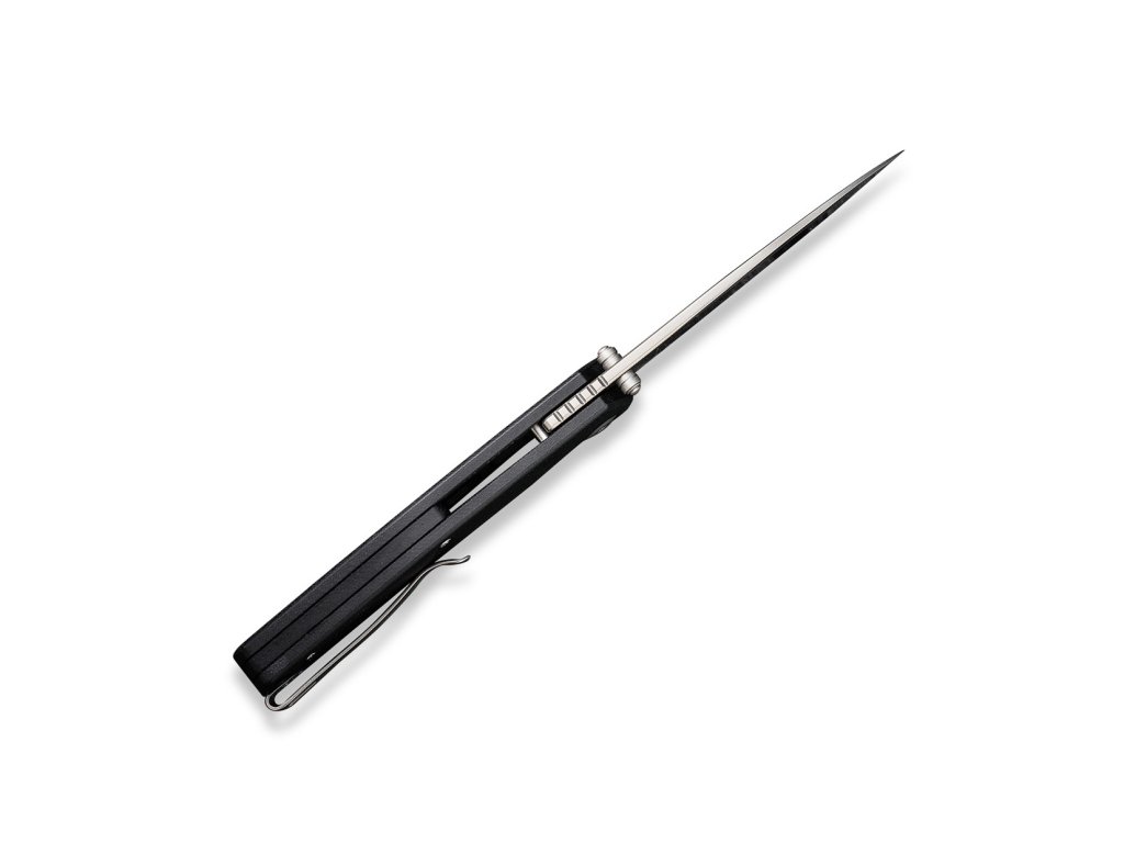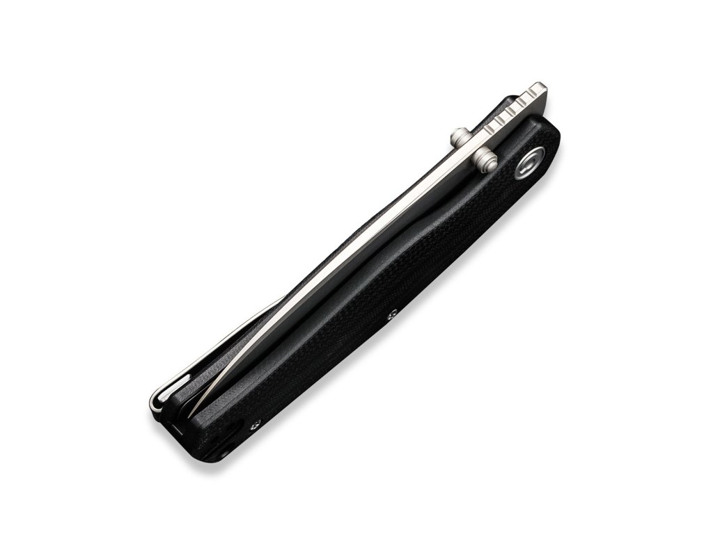Mânerul este fabricat din G10 negru. Clema pentru agățarea cuțitului este realizată din oțel inoxidabil. Deschiderea cu o singură mână este asigurată de un front flipper sau de un știft de pe lamă. Deschiderea cuțitului este foarte ușoară și lină, lama este montată pe rulmenți ceramici.