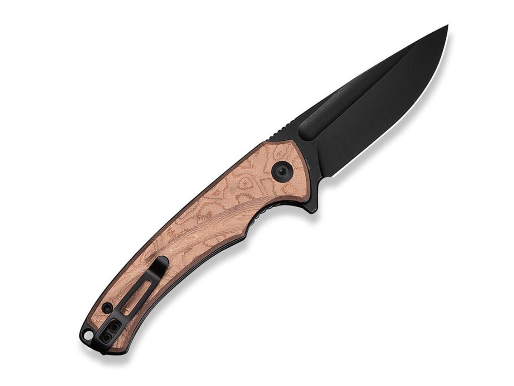 Cuțit pliabil. Lamă neagră din oțel inoxidabil 14C28N. Lungimea lamei 7,4 cm, lungimea totală 17,9 cm. Mâner din folie de cupru și G10. Blocare a lamei liner lock.