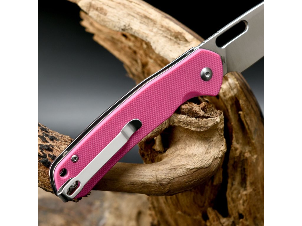 Lama, în formă de wharncliffe, cu lungimea de 7,9 cm, este fabricată din oțel inoxidabil AR-RPM9 și are un finisaj stonewash. Pyrite Pink Wharncliffe este un cuțit pliabil și măsoară 10,8 cm închis. Mânerul este fabricat din material G10 de culoare roz și are un orificiu pentru șnur și o clemă pentru agățare. Blocare a lamei tip button lock. Cuțitul este livrat într-o husă practică din nailon cu fermoar.