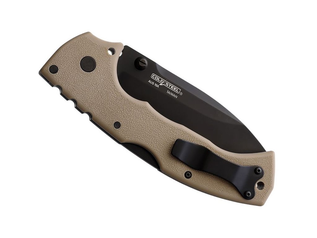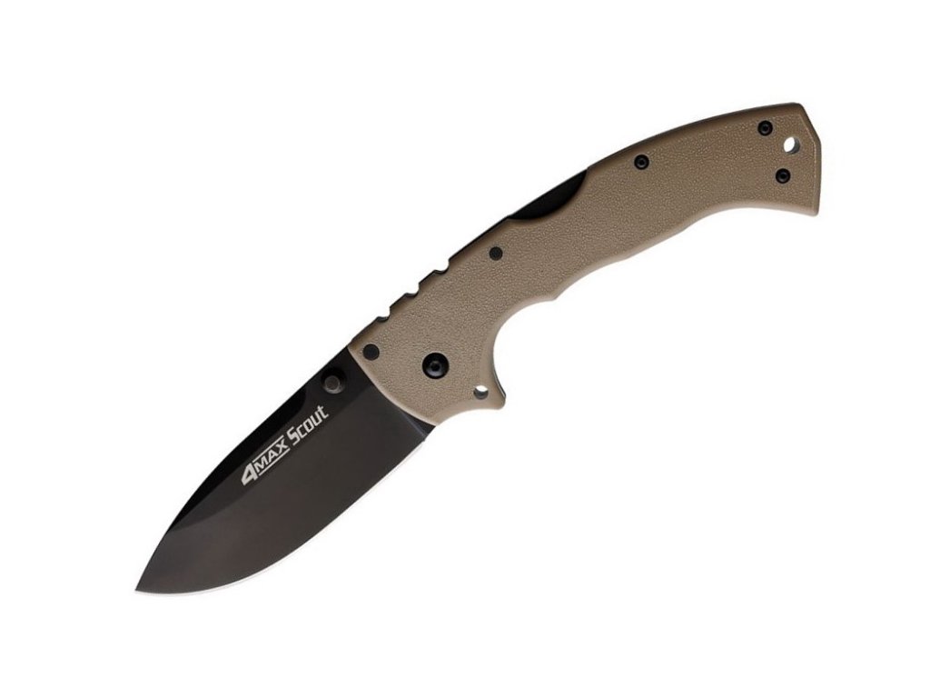Cold Steel 4-Max Scout este un cuțit pliabil mare și masiv, cu o formă a lamei drop point, conceput pentru a face față celor mai dificile sarcini. Lama din oțel inoxidabil AUS-10 este extrem de ascuțită și rezistentă la deteriorare și are un finisaj negru și un tip tăiș flat grind. Cuțitul are o lungime de 10 cm și o lungime totală de 22,5 cm. Mânerul este fabricat dintr-un material compozit extrem de rezistent, Griv-Ex, de culoarea nisipului din deșert. Cuțitul este prevăzut cu un sistem de blocare a lamei Tri-Ad lock, considerat cel mai sigur tip de blocare pentru cuțitele pliabile. Clema pentru agățare din oțel inoxidabil se poate fixa pe ambele părți (dreapta/stânga). Deschidere cu o singură mână cu ajutorul știftului de pe lamă.