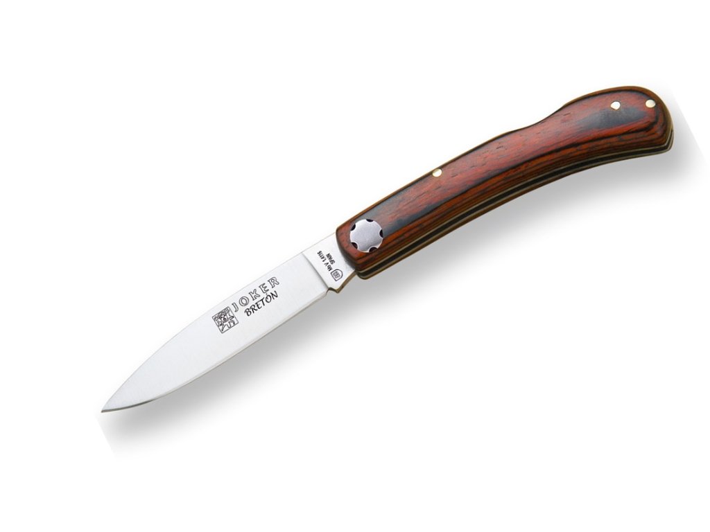 Joker Breton NR44 este un cuțit pliabil simplu, potrivit pentru drumeții, vânătoare sau utilizare zilnică. Cuțitul este fabricat din materiale de bună calitate. Lama, cu finisaj satinat, este fabricată din oțel inoxidabil clasic X50CrMoV15 (1.4116) și are o lungime de 8 cm, o formă drop point și proprietăți de tăiere excelente. Mânerul ergonomic a fost realizat din lemn pakka, un material foarte rezistent. Cuțite are o blocare a lamei Backlock. Datorită greutății sale reduse, este potrivit și pentru purtare zilnică. Este fabricat în întregime în Spania.