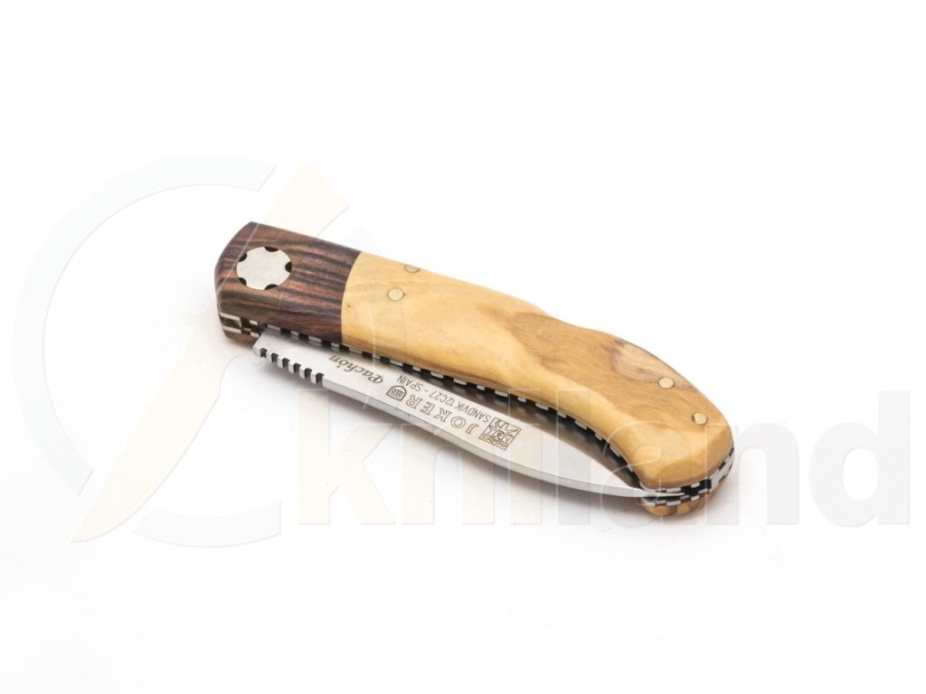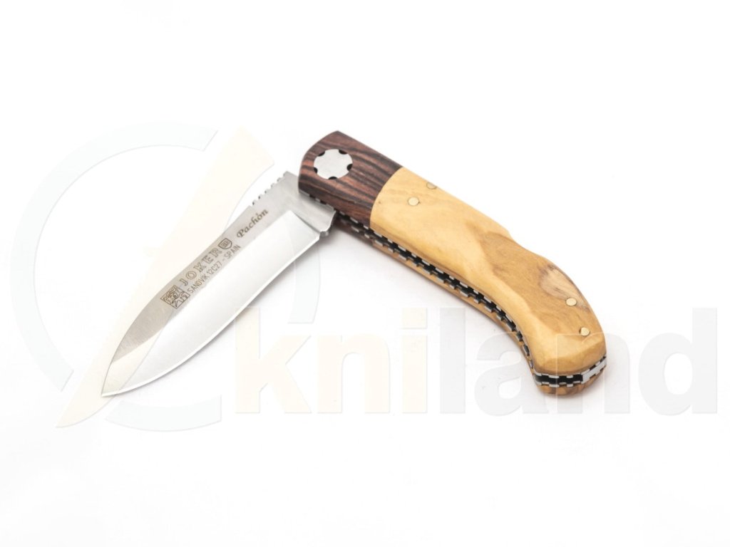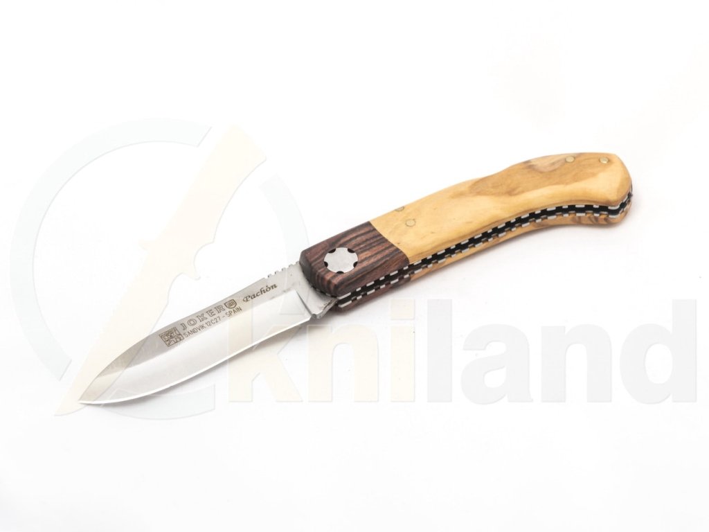 Cuțit pliabil simplu de la producătorul spaniol Joker. Lamă fabricată din oțel inoxidabil Sandvik 12C27. Mâner din lemn de măslin. Blocare a lamei tip backlock.