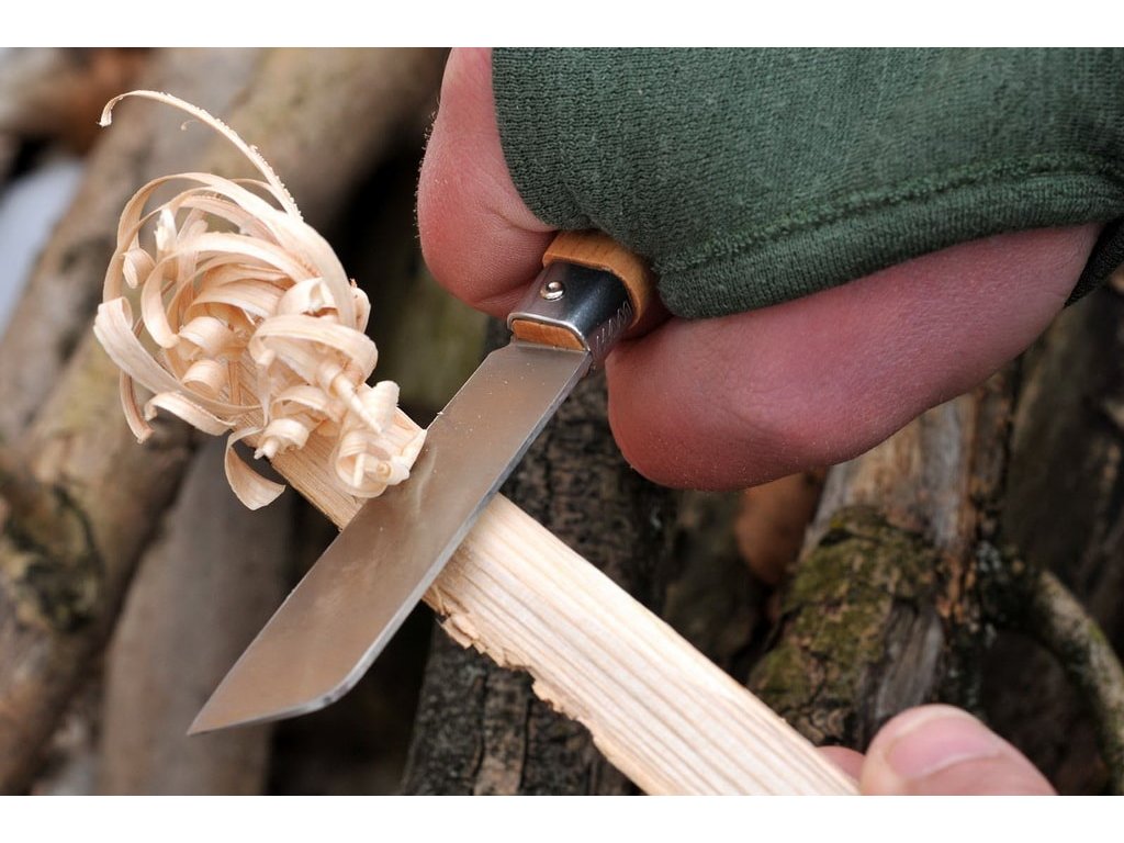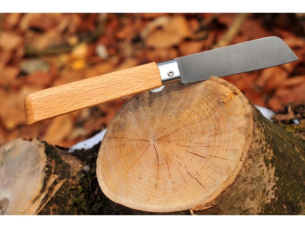 Cuțit pliabil, simplu și practic. Mâner din lemn , lamă din oțel inoxidabil german de tip AISI 420, cu o formă „sheepfoot”.