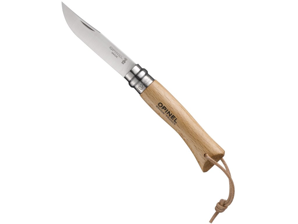 Cuțit pliabil, practic, de la producătorul francez Opinel, cu o lamă din oțel inoxidabil de 8 cm lungime și mâner din lemn de fag, completat cu o curea din piele. Cuțitul are o blocare a lamei tip Viroblock.