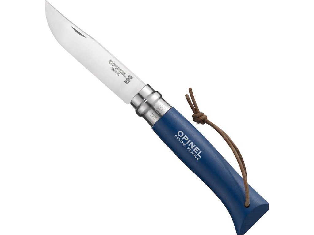 Cuțit pliabil, practic, de la producătorul francez Opinel, cu o lamă din oțel inoxidabil, de 8,5 cm lungime și mâner din lemn de fag, de culoare albastru, completat cu o curea din piele. Cuțitul are o blocare a lamei tip Viroblock.