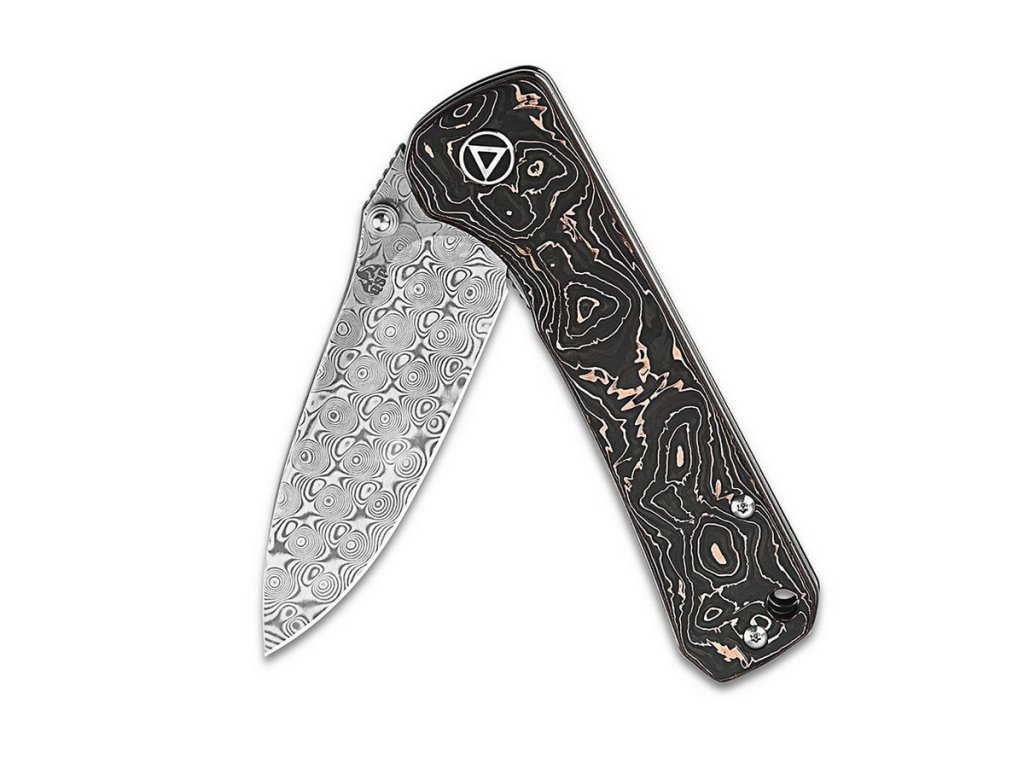 QSP Hawk este un cuțit elegant, de buzunar, fiabil, pentru uz zilnic, fabricat din materiale de calitate. Lama cu grosimea de 3 mm este fabricată din oțel laminat Damasc, are formă drop point și un tăiș flat grind. Mânerul este din fibră de carbon cu adaos de cupru. Cuțitul are un sistem de blocare a lamei de tip liner lock și o clemă de prindere din oțel. Deschidere cu ajutorul unui știft de pe lamă sau cu ajutorul unui flipper.