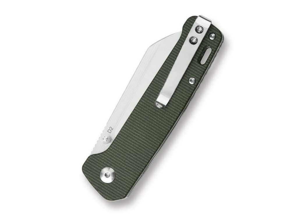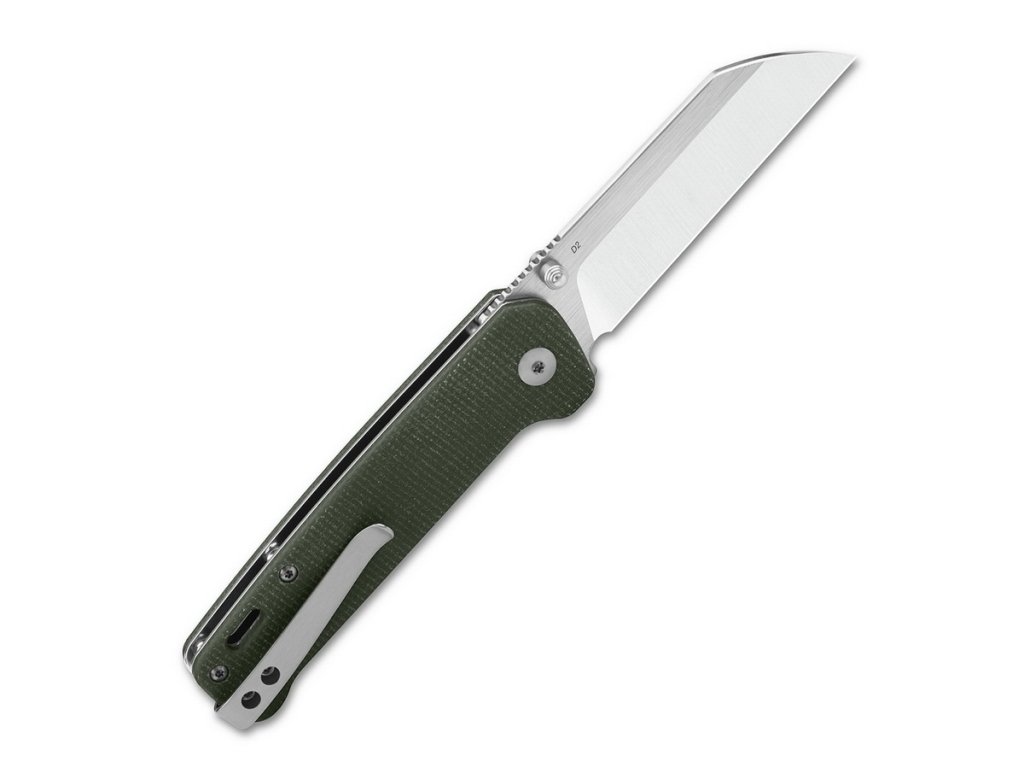 QSP Penguin este un cuțit pliabil elegant și fiabil, fabricat din materiale de calitate. Forma caracteristică a lamei sheepsfoot conferă cuțitului proprietăți de tăiere bune, permite efectuarea de lucrări fine cu vârful lamei și este foarte ușor de ascuțit. Lama, din oțel pentru unelte D2, are o grosime de 2,6 mm, un finisaj satinat și un tăiș flat grind. Mânerul este fabricat din micarta texturată, verde. Cuțitul are un sistem de blocare a lamei tip liner lock și o clemă de agățare din oțel care se poate fixa pe ambele părți. Deschidere cu ajutorul unui știft pe lamă.