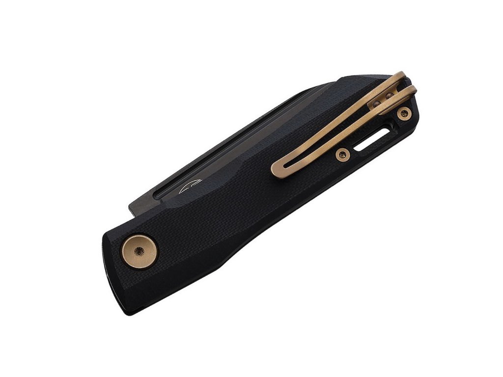 Mânerul este fabricat din G10 negru. Mânerul are o formă neobișnuită, dar este foarte ergonomic și se potrivește confortabil în mână. Are o clemă pentru buzunar.