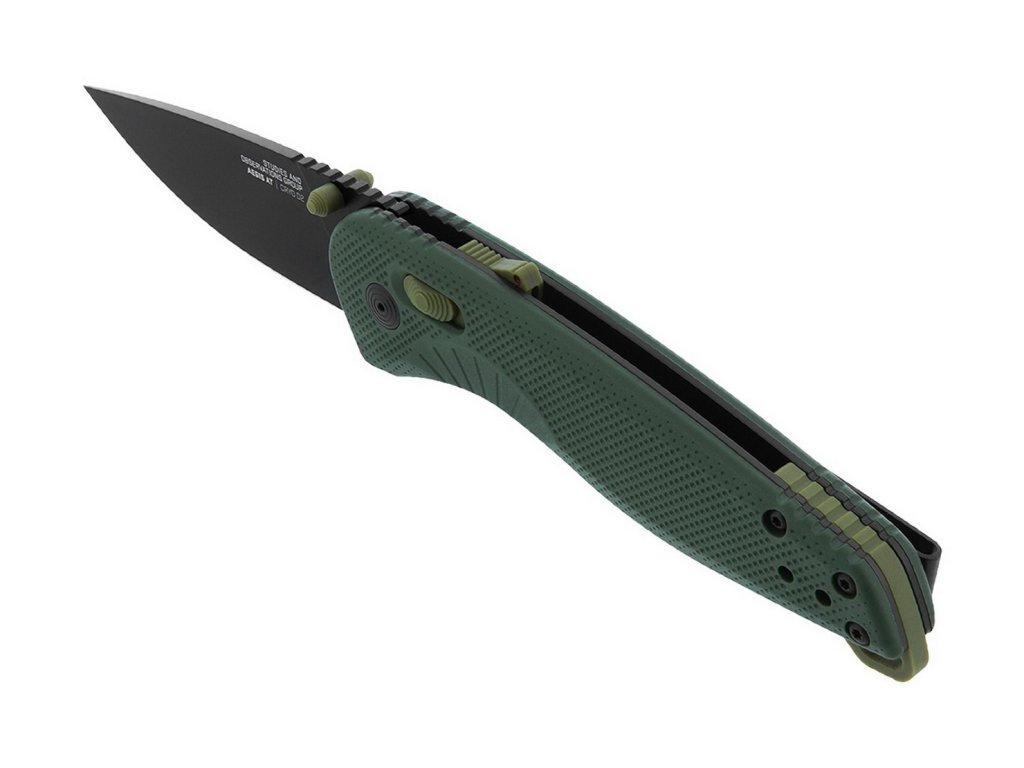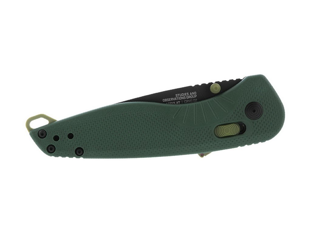 Cuțit pliabil, conceput pentru utilizare în natură. Aegis AT se caracterizează prin deschidere rapidă asistată și blocare a lamei inovatoare SOG AT-XR Locki. Lama, din oțel pentru unelte D2 tratat criogenic, are lungimea de 7,9 cm și finisaj cu nitrură de titan. Mânerul este fabricat din GRN (material compozit rezistent și durabil) de culoare verde, cu finisaj anti-alunecare. Are o clemă pentru agățarea cuțitului din oțel inoxidabil. Deschidere cu o singură mână cu ajutorul știftului de pe lamă.