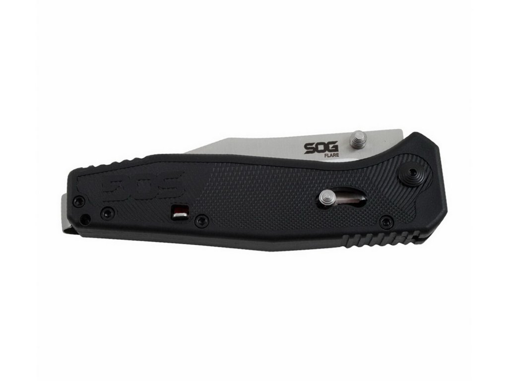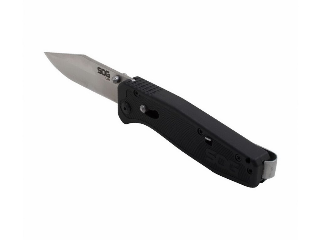 Cuțit pliabil conceput pentru utilizare zilnică. Este un cuțit de buzunar simplu și robust, cu lamă SOG Sharp și sistem de blocare a lamei tip Arc lock. Lama de 8,7 cm, din oțel 8Cr13MoV, în formă de clip point are un finisaj mat. Mânerul este fabricat din GRN (material compozit rezistent și durabil) cu finisaj anti-alunecare. Clema din oțel inoxidabil pentru agățarea. Deschidere cu o singură mână cu ajutorul unui știft de pe lamă.
