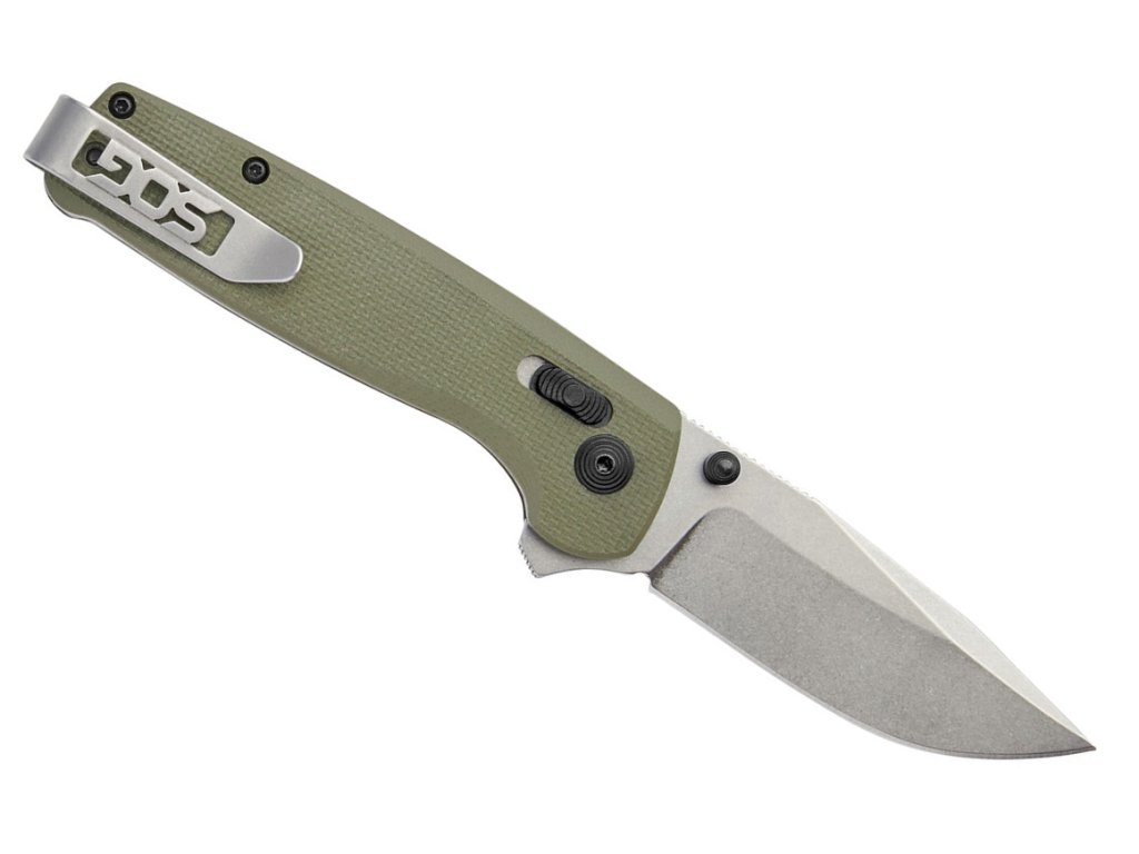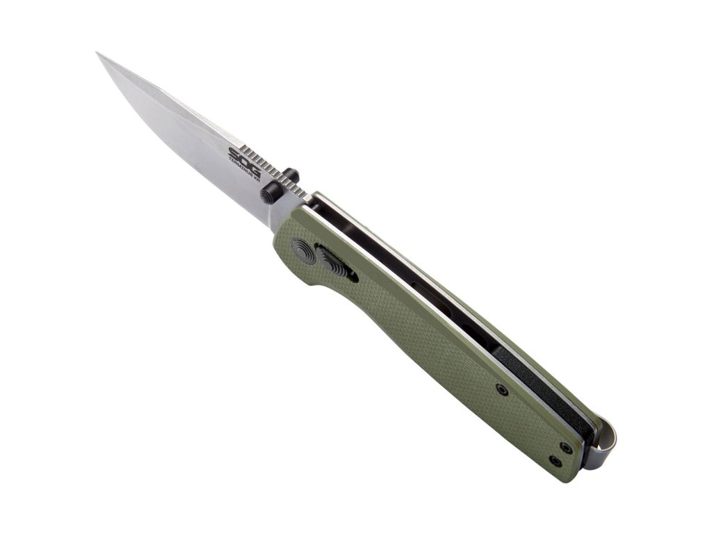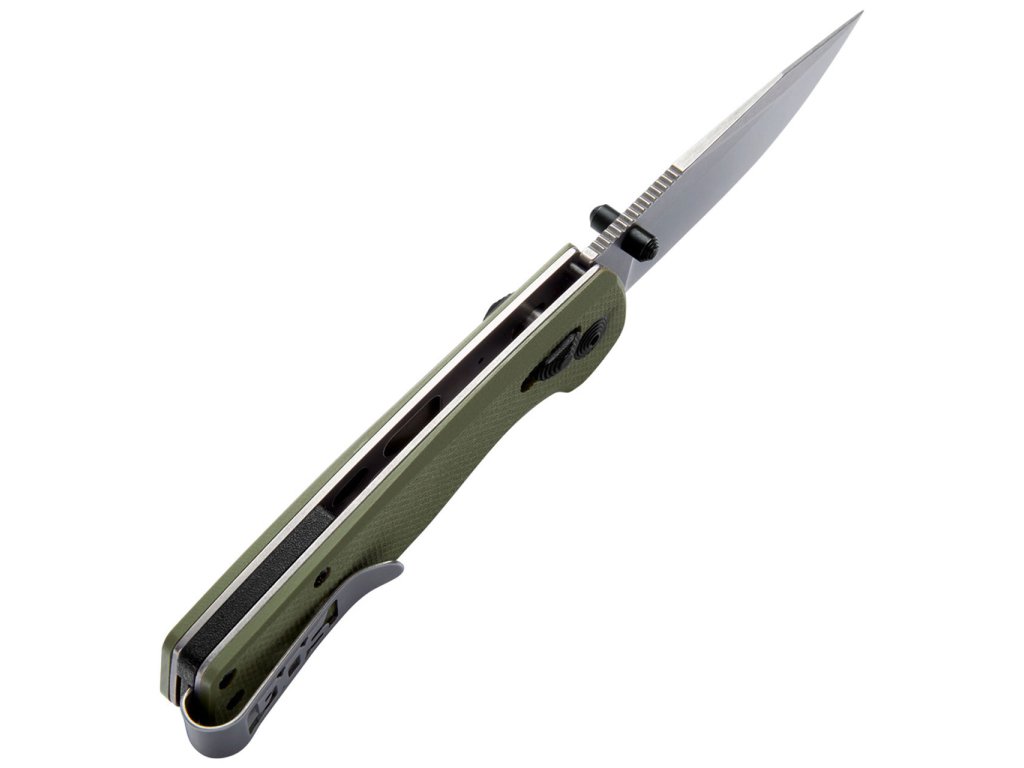 Cuțit pliabil din oțel pentru unelte D2. Lungimea lamei 7,5 cm, lungime totală 18,3 cm. Mâner din G10 verde măsliniu. Ambalat într-un blister.