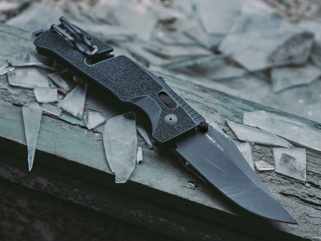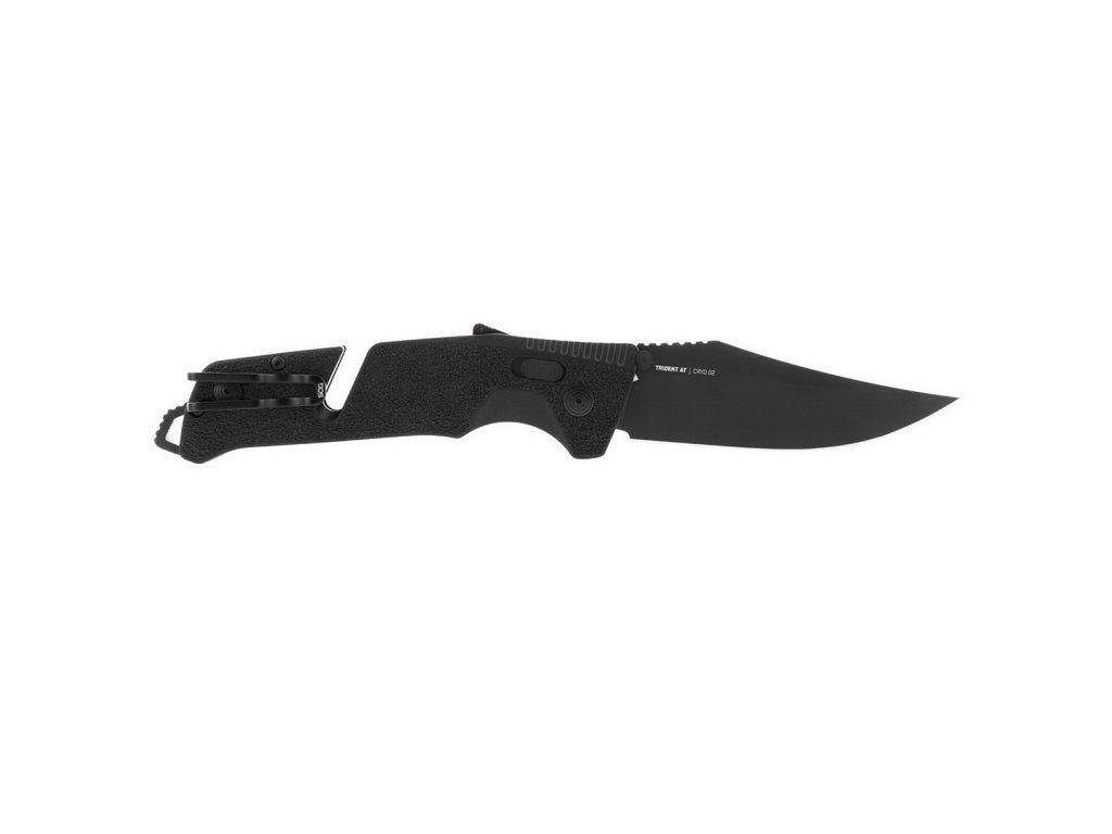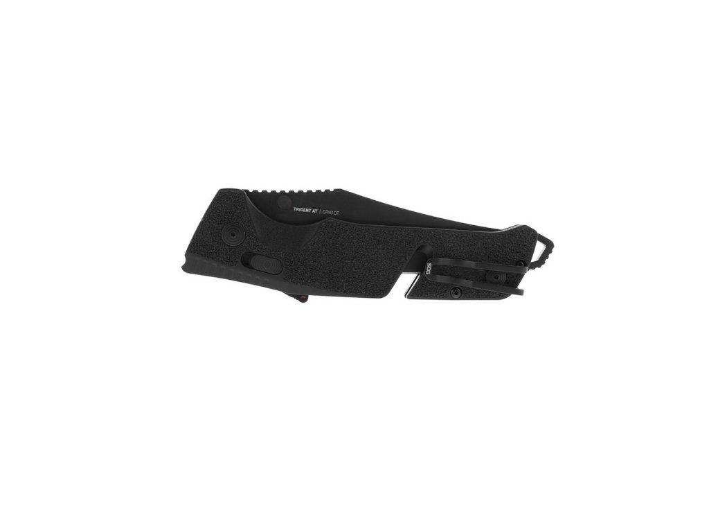 Cuțitul pliabil Trident AT, conceput pentru utilizatori profesioniști și forțele de ordine, se caracterizează prin deschidere rapidă asistată și blocarea lamei inovatoare SOG AT-XR Lock. Lama în formă de clip point este fabricată din oțel pentru unelte D2 tratat criogenic, cu o lungime de 9,4 cm, cu tăiș flat grind și finisaj din nitrură de titan. Mânerul este fabricat din GRN, de culoare neagră (material compozit rezistent și durabil), cu finisaj anti-alunecare. Clemă pentru agățarea cuțitului din oțel inoxidabil. Deschidere cu o singură mână cu ajutorul unui știft pe lamă. Cuțit este echipat cu un tăietor de frânghii (de exemplu, paracord) și un spărgător de sticlă.
